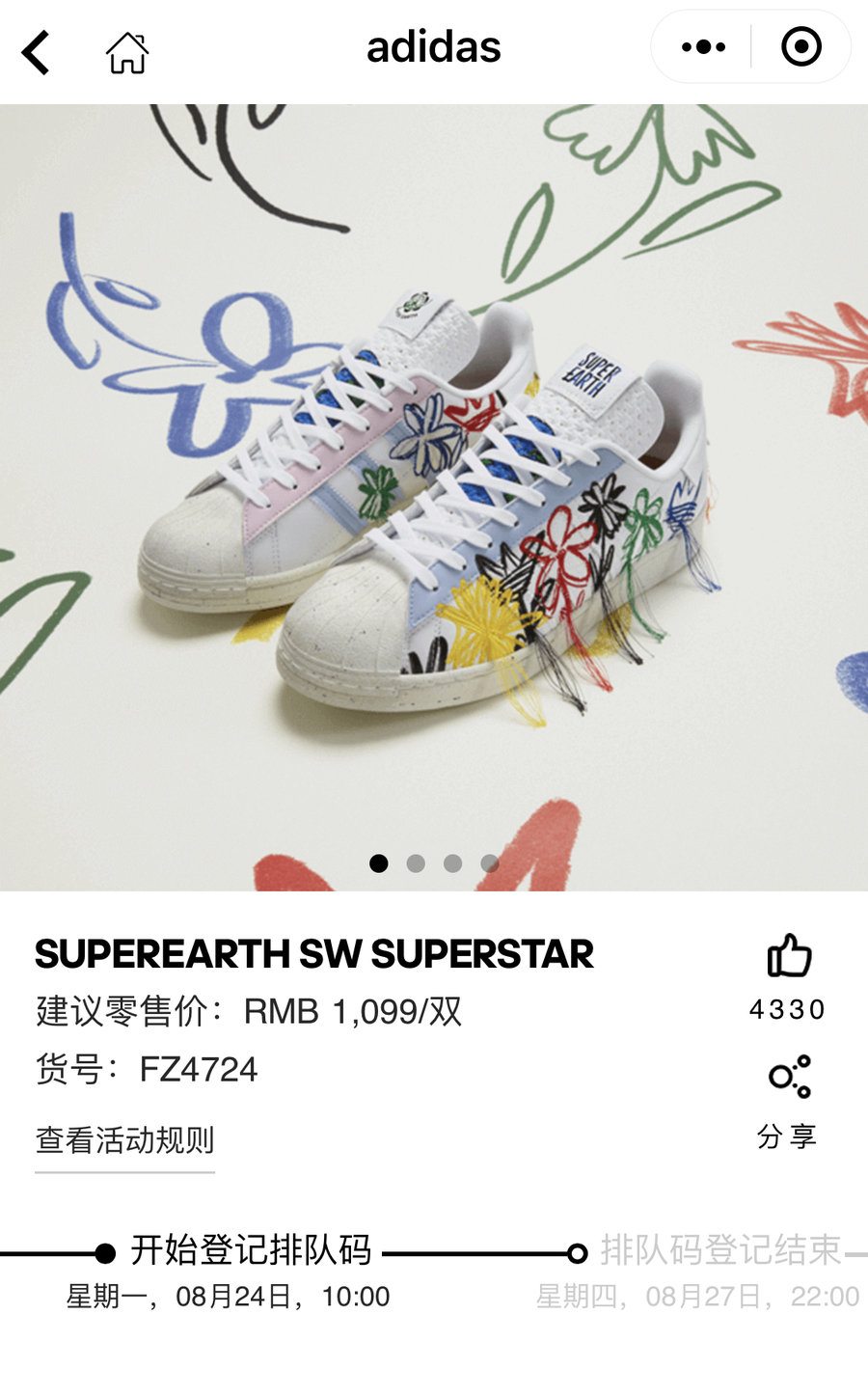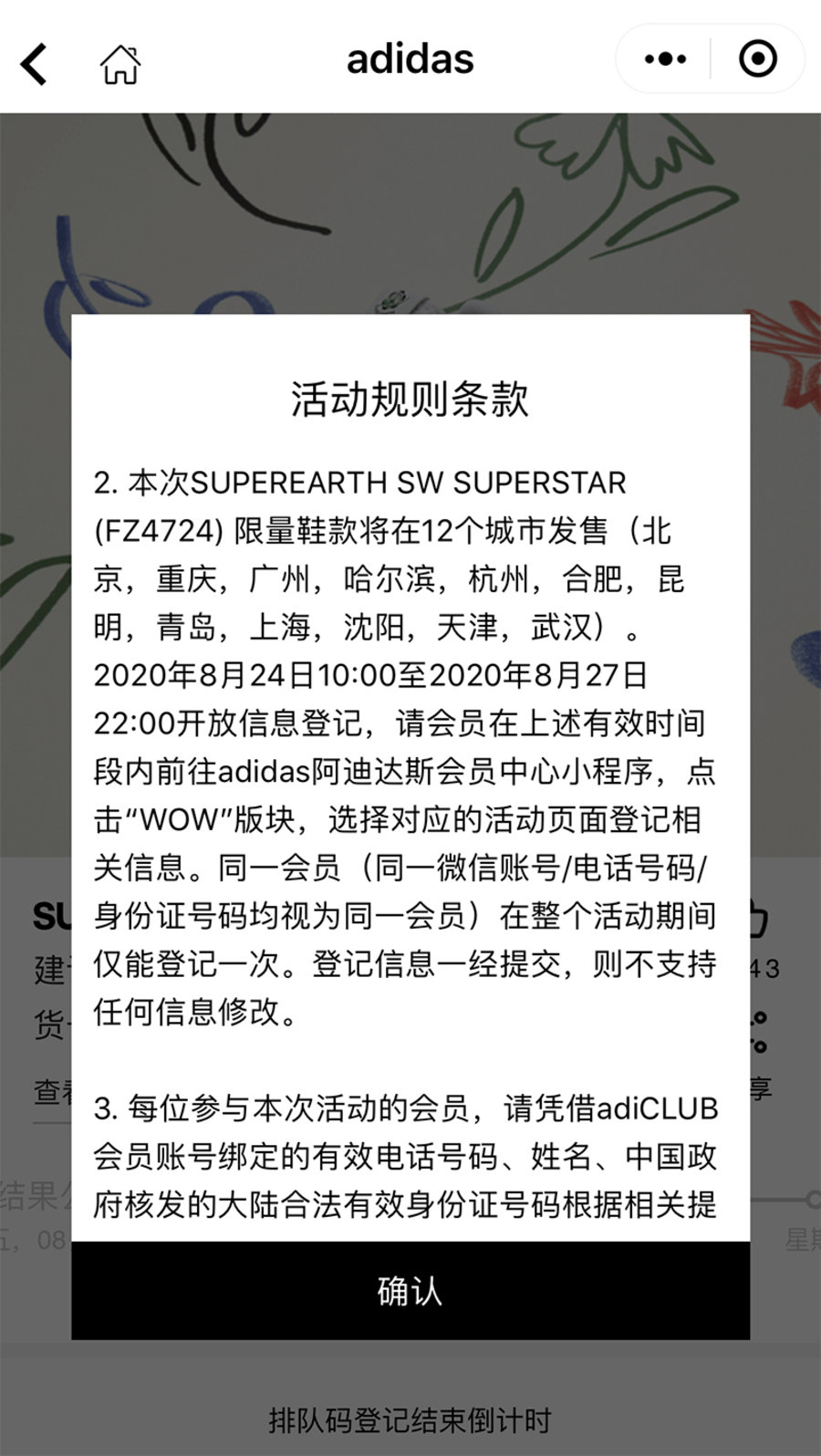 目前,adidas 会员中心微信小程序截止登记时间为 8 月 27 日 22 时,随后 8 月 28 日 14 时公布中签结果。