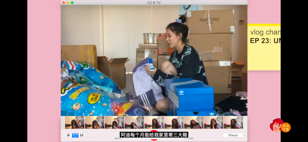 宋妍霏曾在一期 Vlog 里透露 “adidas 每个月都会给我寄三大箱”。