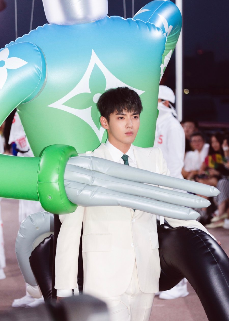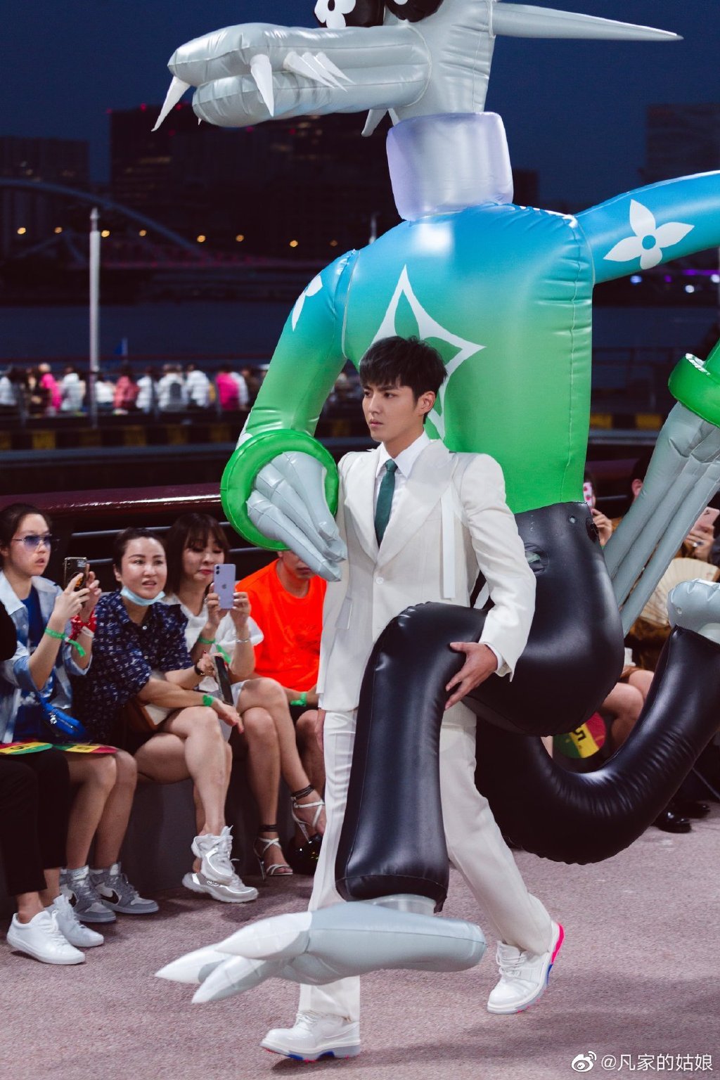 在港口有风的情况下,背着大玩偶走 1 公里的秀场来回,保持姿态、表情坚毅,吴亦凡的专业性没的说。