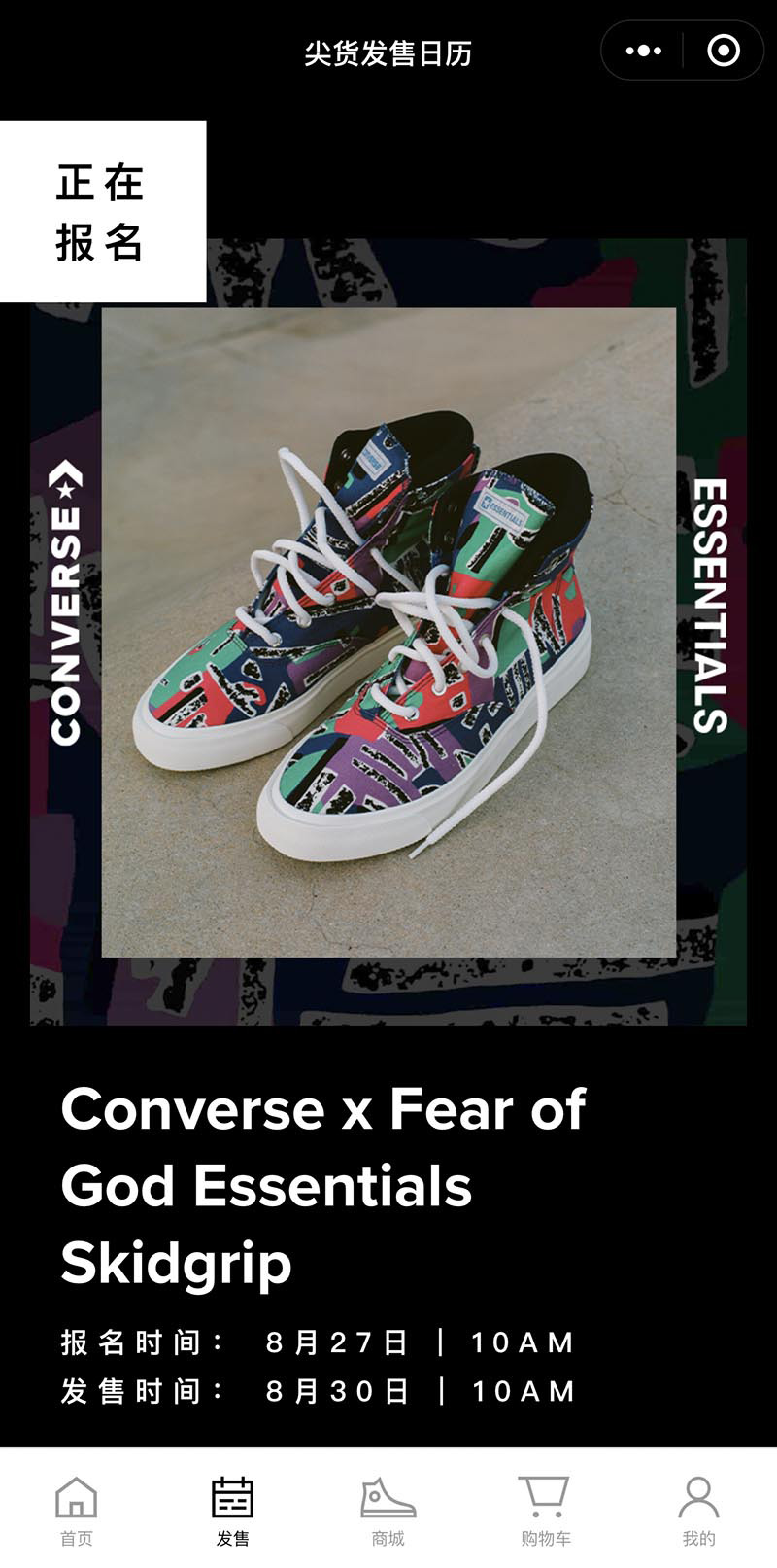 周杰伦、白敬亭、欧阳娜娜纷纷上脚的 Converse x Fear of God ESSENTIALS Skidgrip,今早 Converse 微信小程序刚刚开启报名登记,揭开双方收官之作的发售序幕!