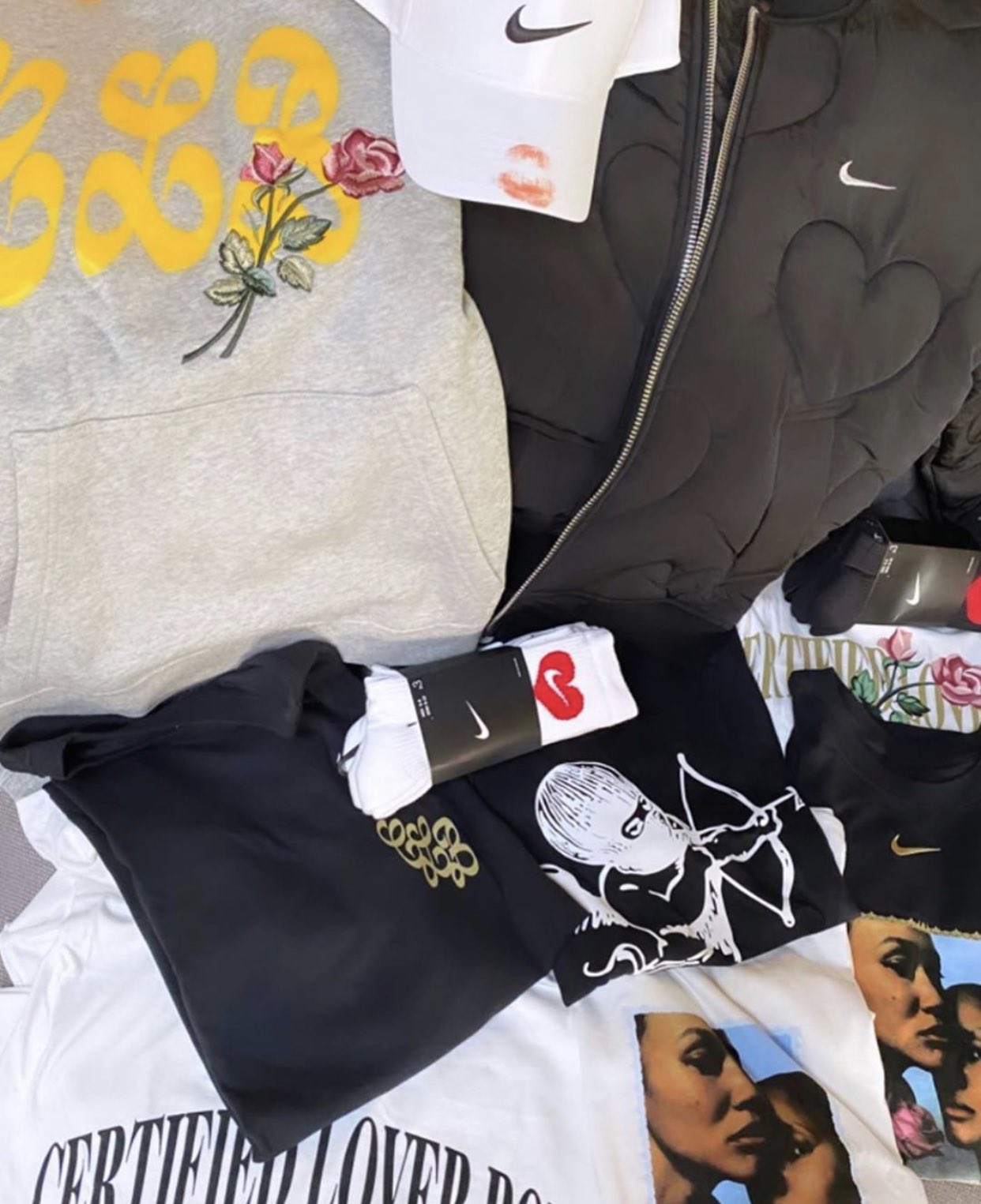 可以明显感受到整个系列都是以爱情为主题,比如帽衫上的玫瑰花刺绣、帽沿上的红色唇印图案,还有袜子上的红色心形 Logo,不知道还以为是 Nike 明年的情人节系列提前曝光了!