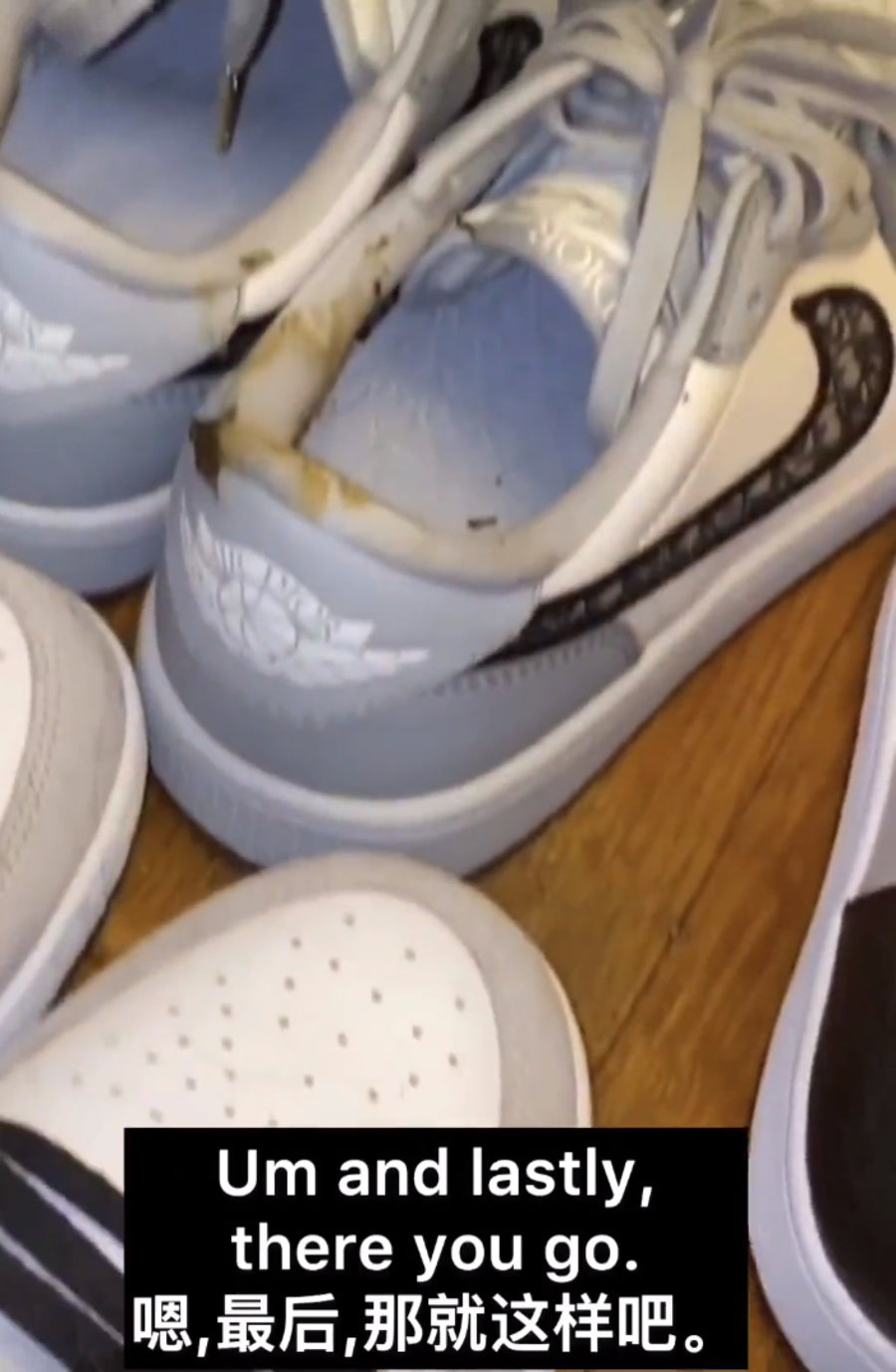 一大坨粑粑直接拉在了 Air Jordan 1 Low 的鞋帮里,还有一些排在了 LV 定制版的 YEEZY FOAM RUNNER 上。