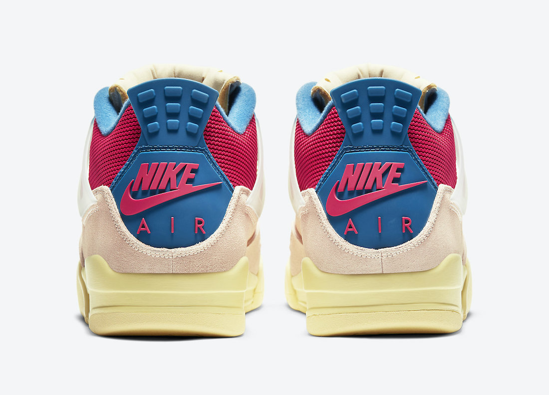 整双鞋最大的特点就是将鞋舌外翻,原本在鞋舌内侧倒置的 “AIR JORDAN” 缝标可以显露而出,鞋舌使用缝线固定,如果把缝线拆除就能变成 Air Jordan 4 传统的长鞋舌,并露出熟悉的 Jumpman 和 Union Logo。
