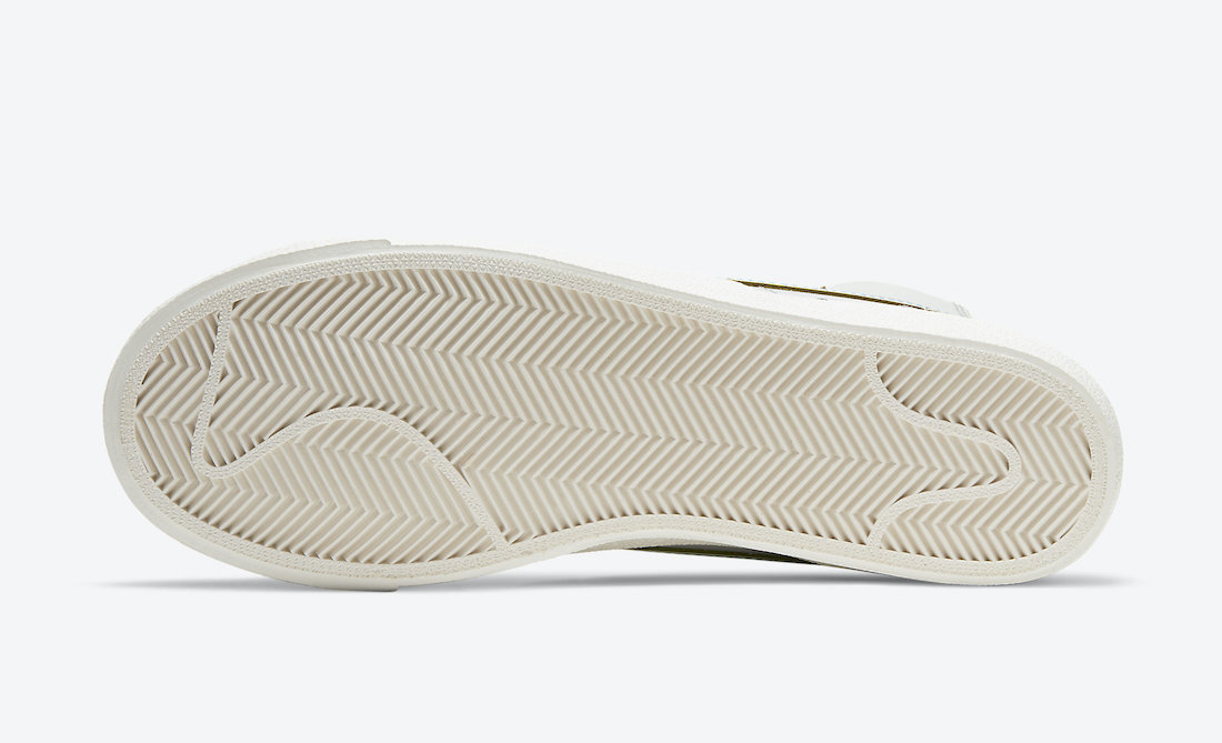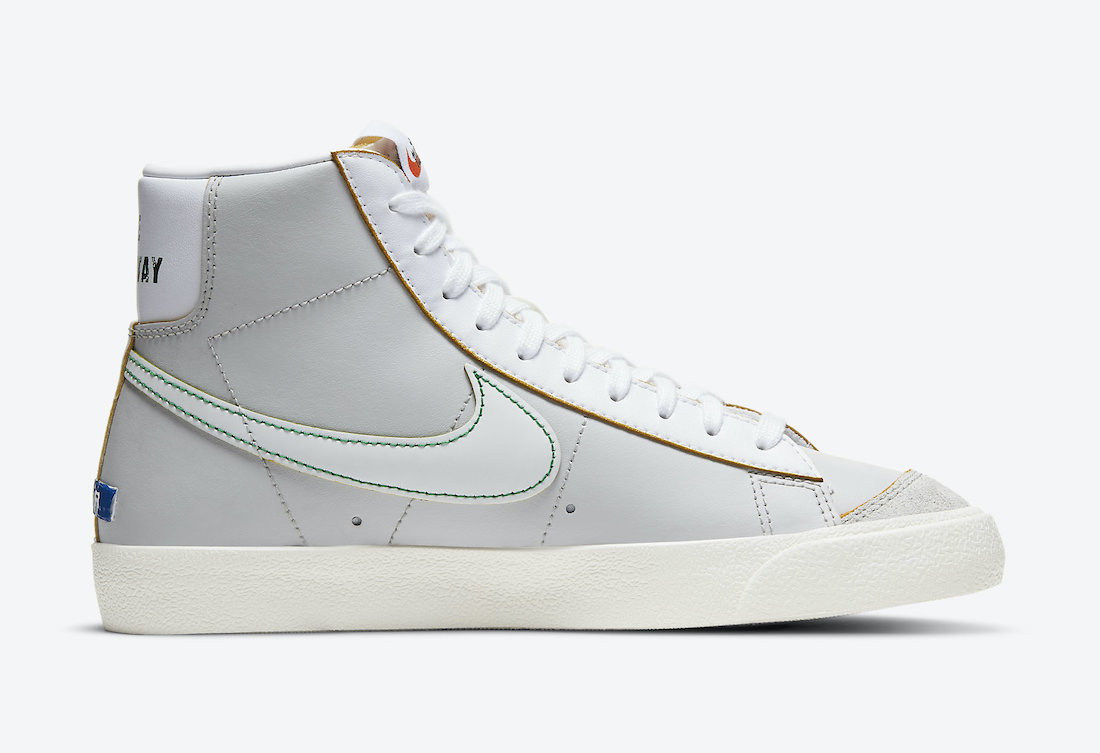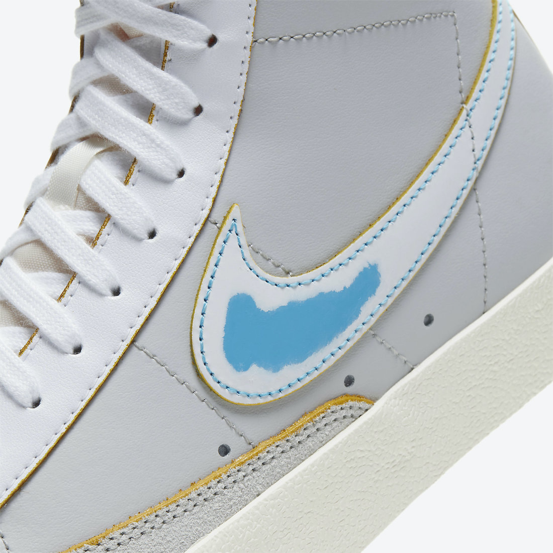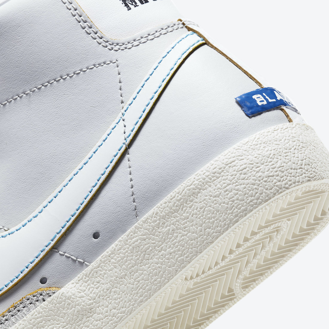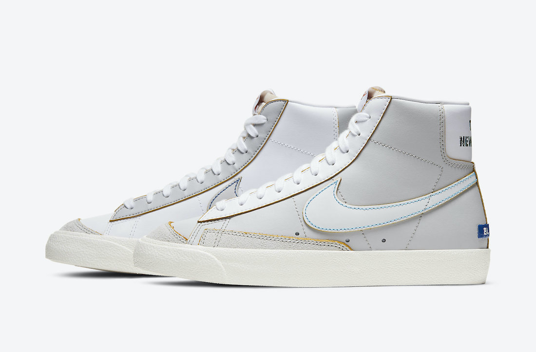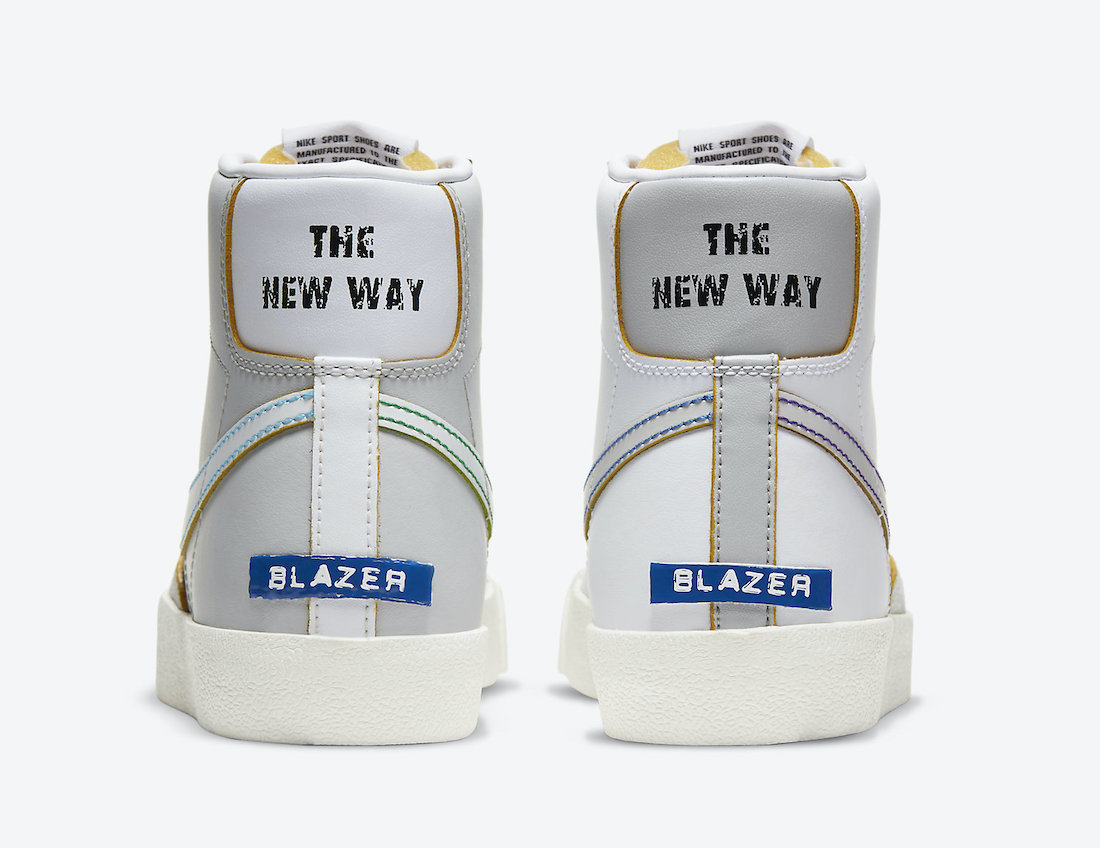 蓝色缝线与鞋面材料裁剪的黄色切割面都算是提升辨识的不错点缀,后跟上艺术风格的 “THE NEW WAY” 和 “BLAZER” 字样增添趣味性。