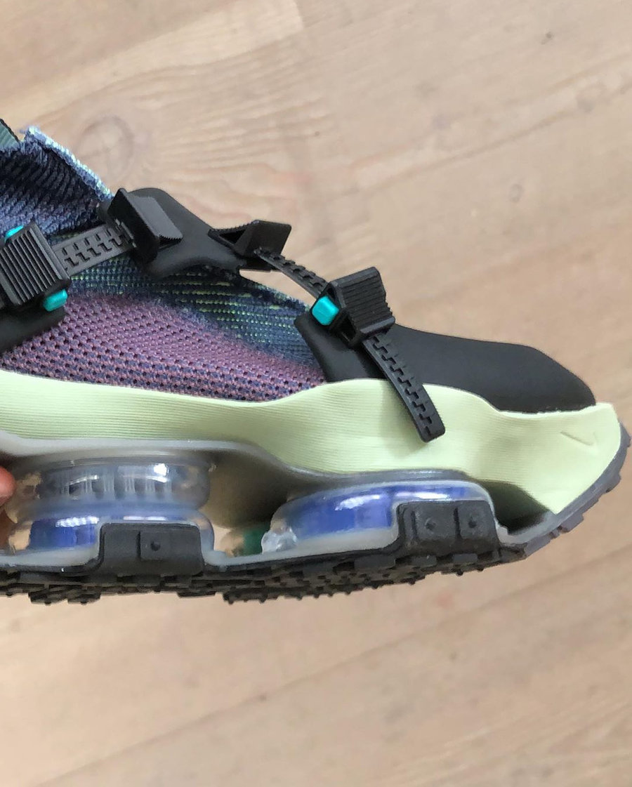 黑色框架、暗紫色鞋面再加上淡绿色的中底,夸张的造型在整体颜色的衬托下好像显得也没那么奇怪了。