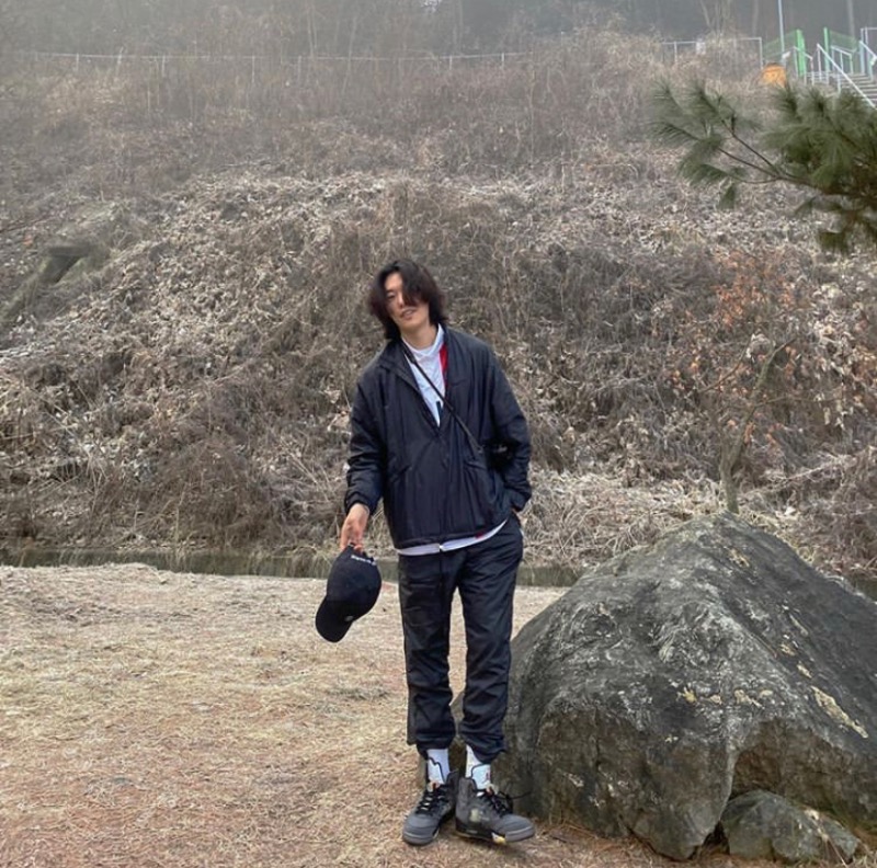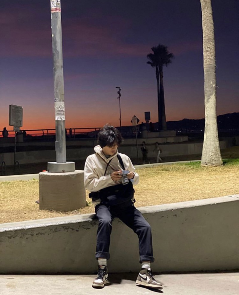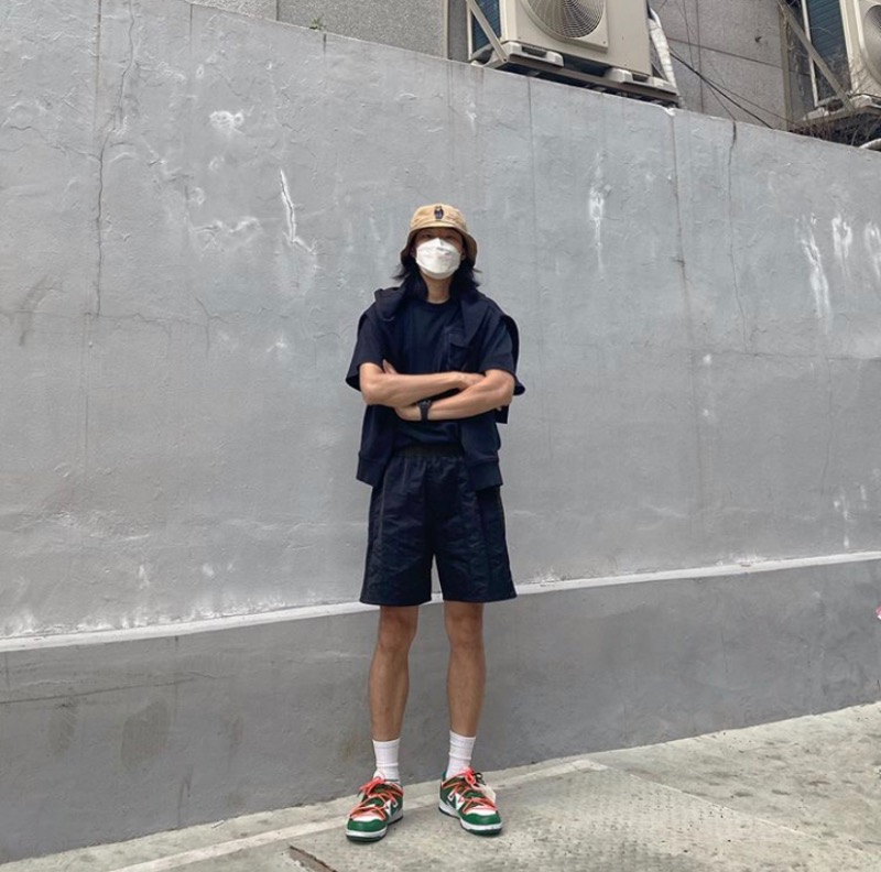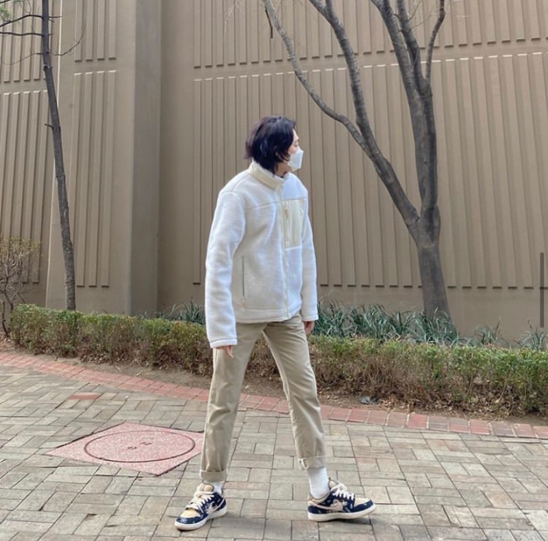 近期他上脚 OFF WHITE x Nike Dunk Low,搭配白色长袜和深蓝色工装,大长腿加上文艺范儿长发,制造出浓郁的痞帅感。