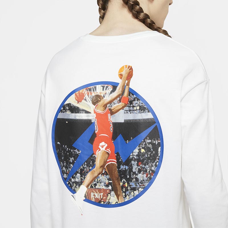细节方面既有闪电映衬乔丹飞跃扣篮的潇洒身影,也有背后硕大 Jumpman 撞色的醒目营造,辨识度超高。