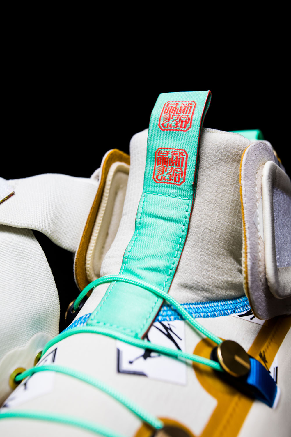 湖绿色鞋舌拉环上有独特红色印章图案,右边是「贰拾」两字,左边是篆体「叁」和数字 23 的结合,凸显中国主题,也是东单配色的专属细节。