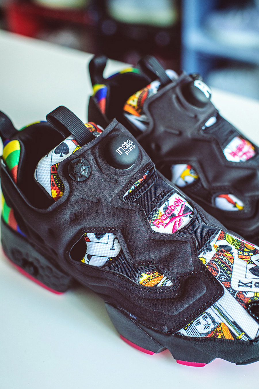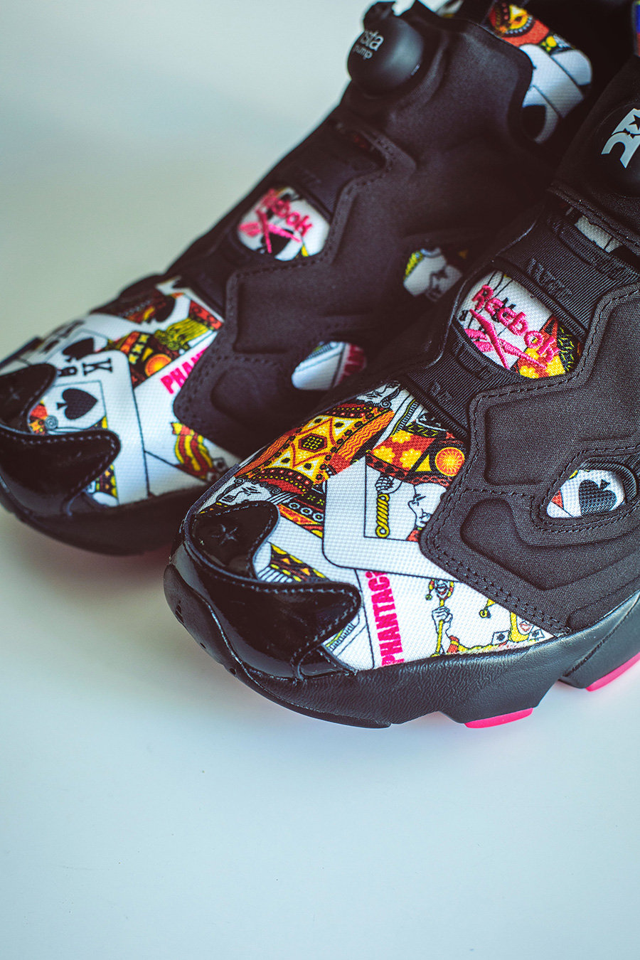 在黑色的基调下,鞋面以非对称的方式呈现了扑克牌图案,细节上还有 PHANTACi 字样和 LOGO。