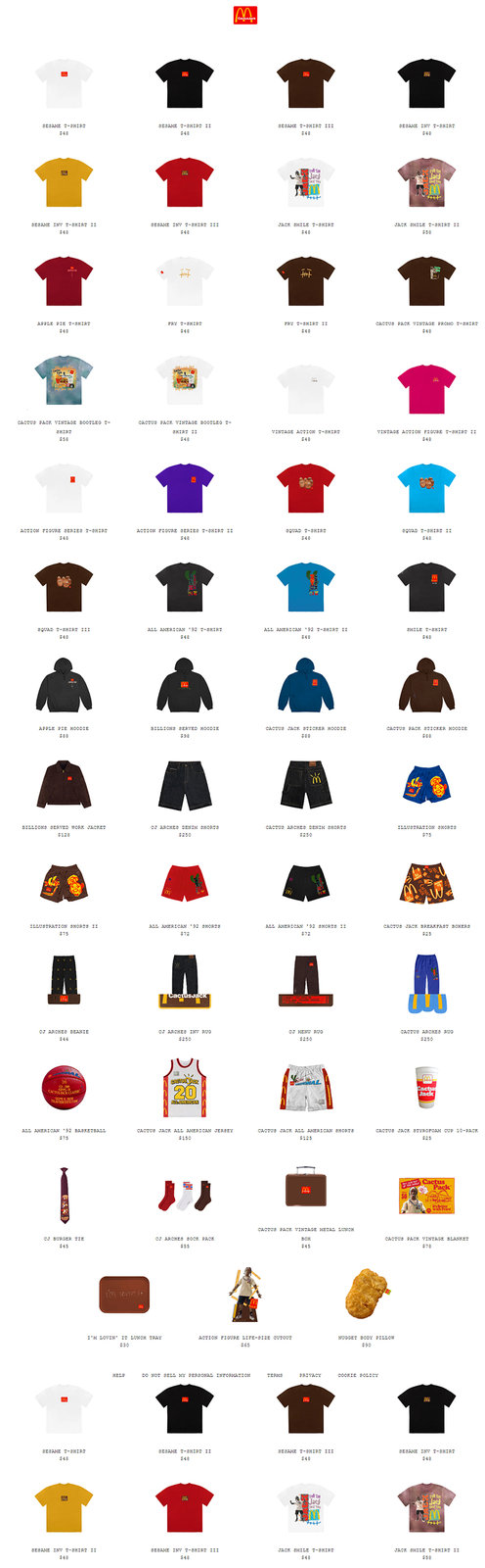 此外,Travis Scott 一边忙着卖薯条汉堡,另外一半 Travis Scott 官网上架了本次 Cactus Jack For McDonald’s 近 60 件单品。