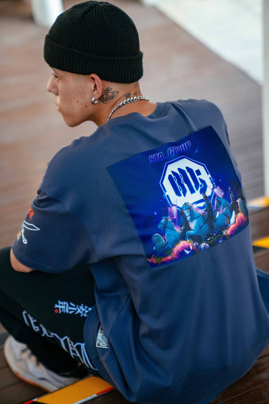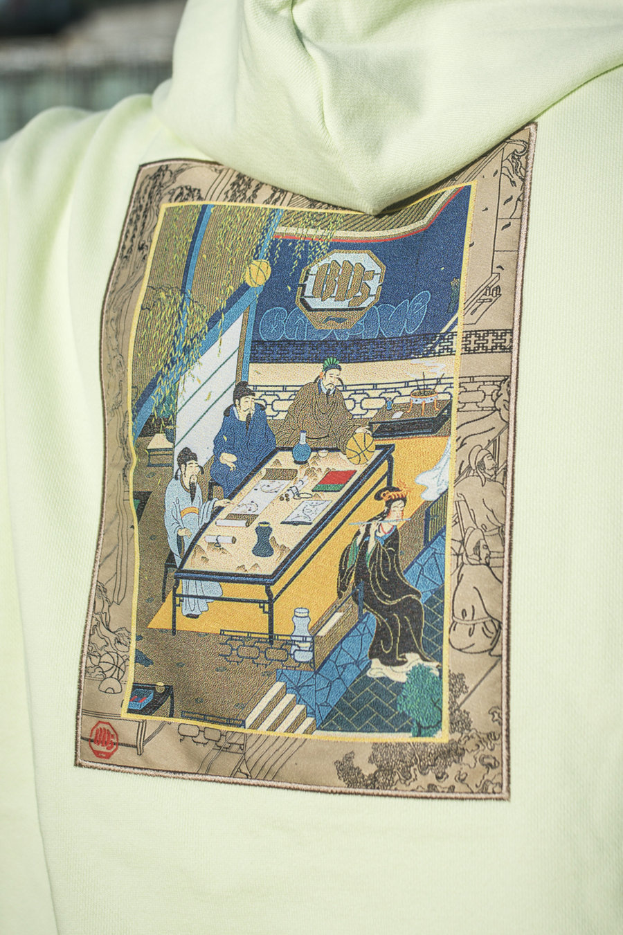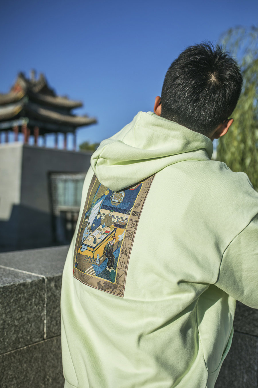 T 恤胸前,背后均为印花工艺。而卫衣则更为重磅,胸前融入立体刺绣,背后则是大面积织锦呈现的画作。