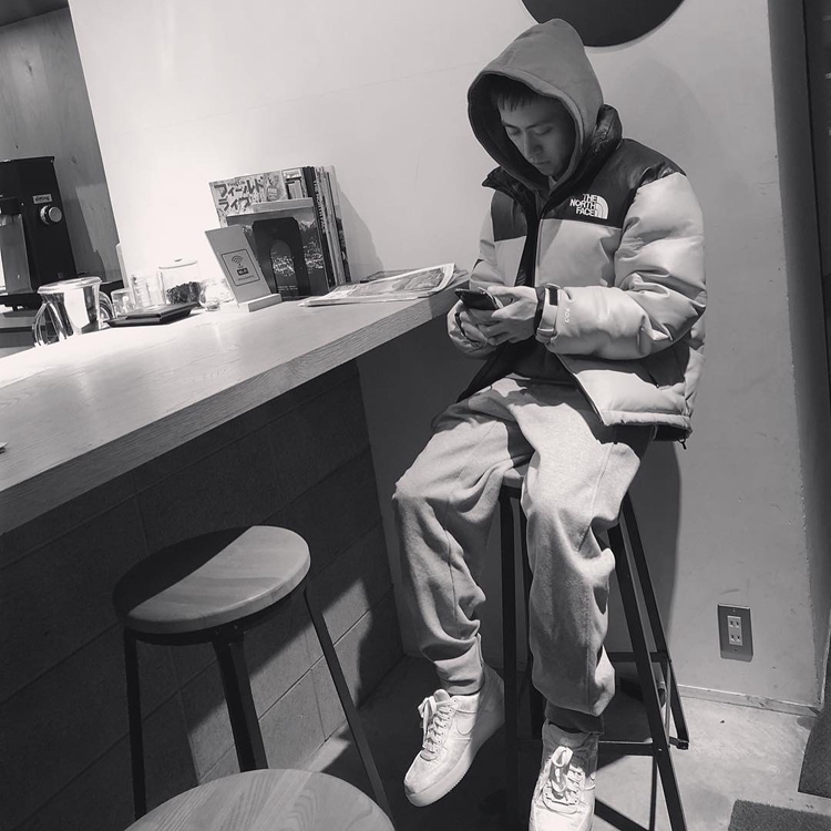 但其实小编最早关注到秦奋是当时白丝绸刚刚发售的时候,经典 TNF 羽绒服搭配灰色运动裤,脚上的白丝绸属实瞩目。