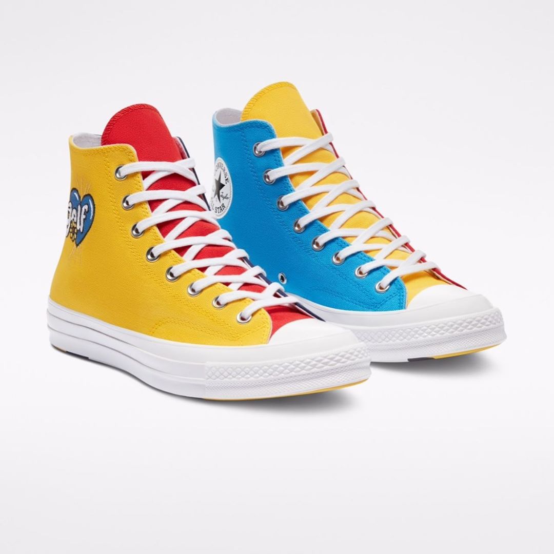 这一联名系列以 Tyler 旗下的 GOLF WANG 品牌作为门面,选用了经典鞋型 Chuck 70 Hi 作为蓝本,golf 字样则直接呈现于鞋面。