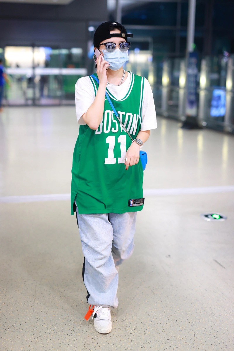 向来以甜美为风格的阚清子一改往日形象,穿起 NBA 欧文球衣和 Oversize 水洗色牛仔裤,上脚 OFF WHITE 球鞋。