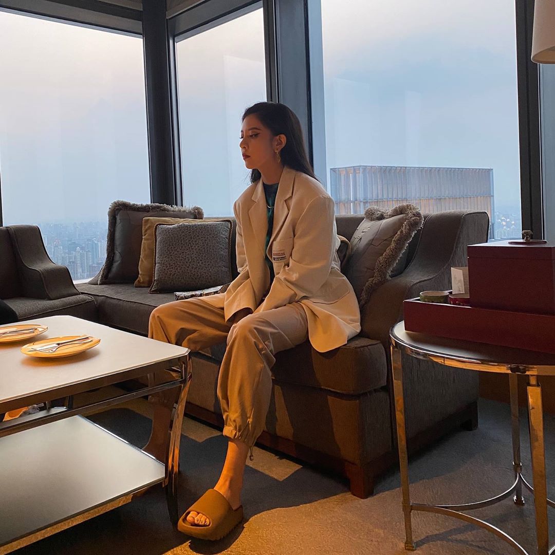 复古风西服外套,搭配前卫 Yeezy Slide 拖鞋,把居家风穿出了几分商务味。