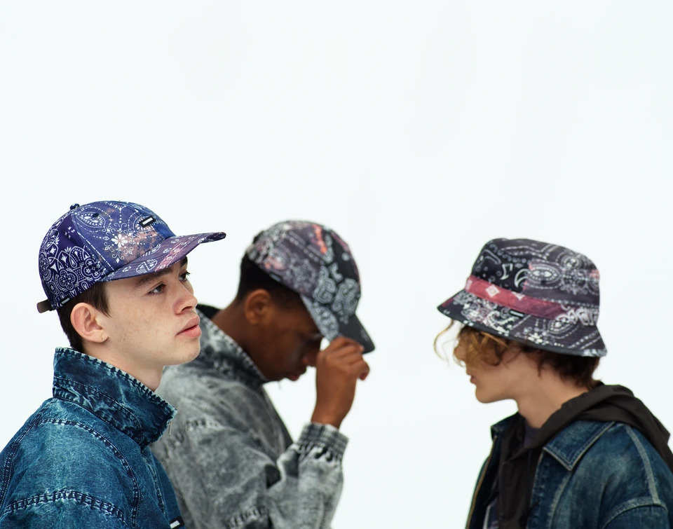 在风格灵感上体现出 1980 年代的时尚氛围,以复古洗水 Bandana 拼贴图案的涤纶面料制成的宽身田径外套、衬衫与各式帽款,成为本季度的焦点之作。