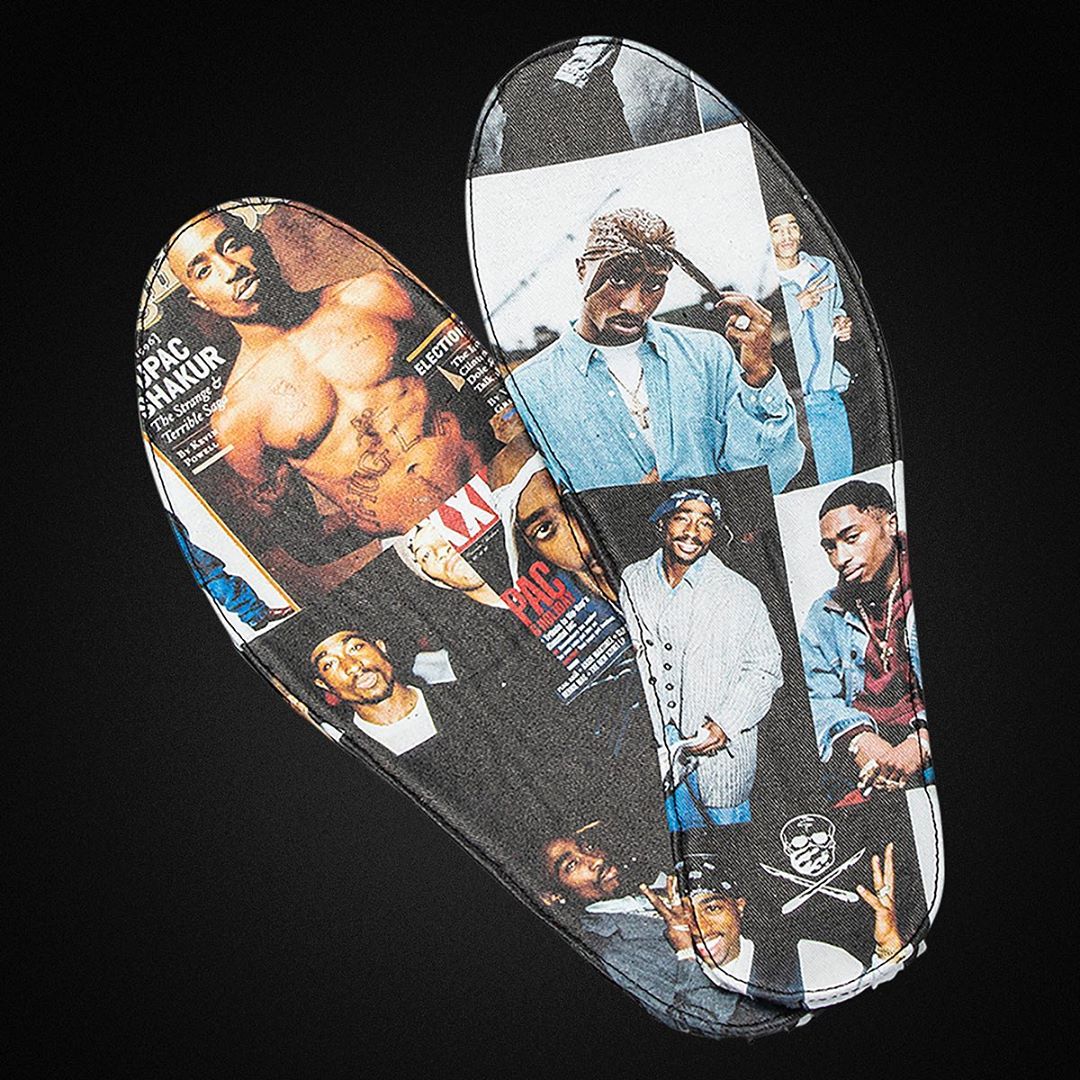 鞋舌刺绣有 Tupac Amaru Shakur 全名和生卒年分,后跟的 “THUG LIFE” 同样是 Tupac 代表之一,就连皮质鞋垫都印有 Tupac 的经典照片。