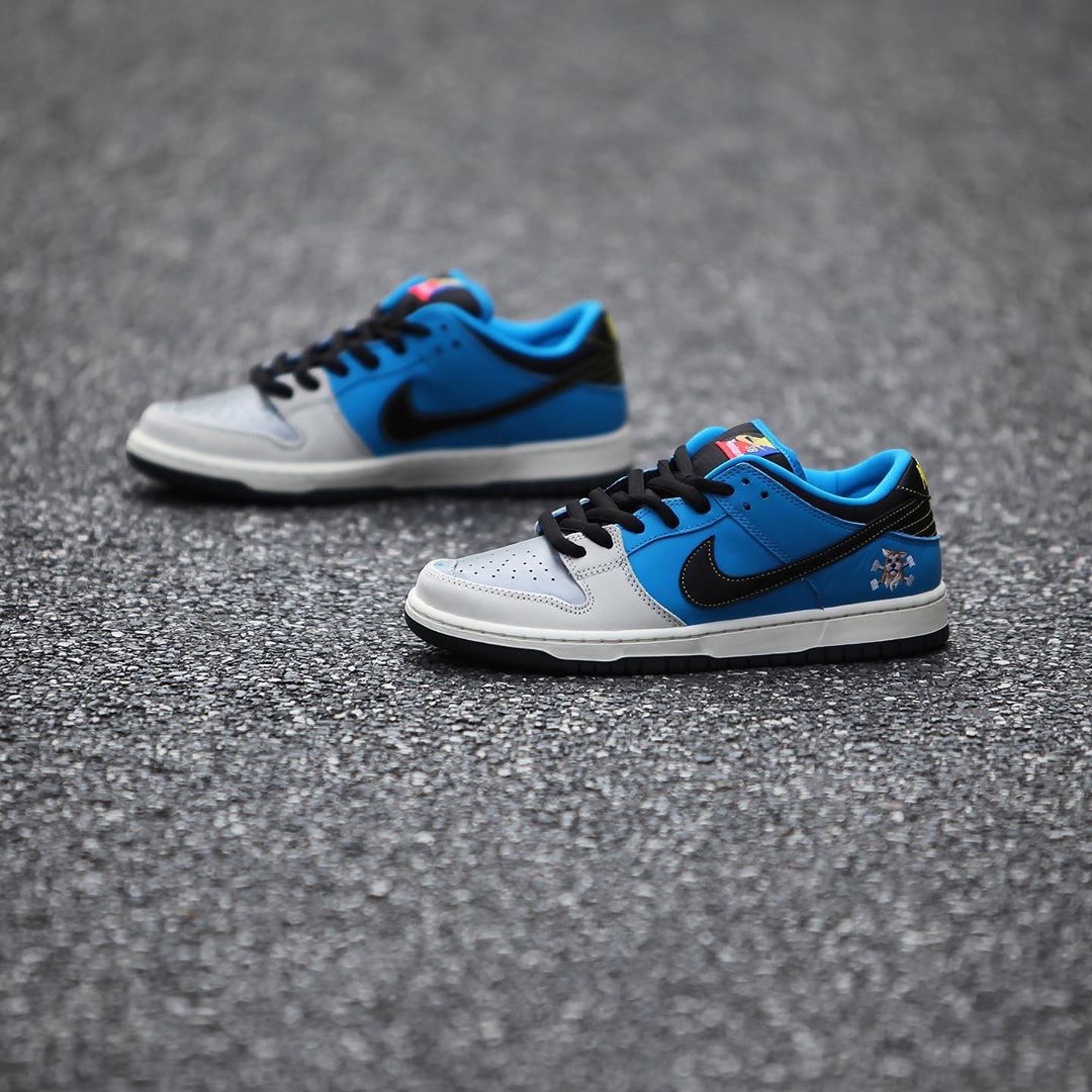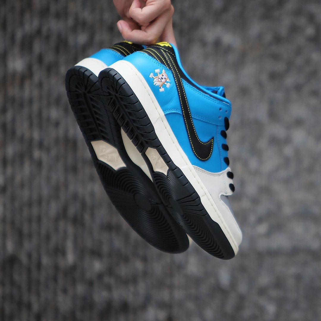 鞋身后跟处刺绣有 Instant Skateboards 狗头 Logo 点缀,彰显联名身份,也因此得名「狗头」SB Dunk Low。