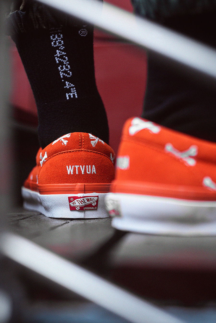 首先便是小编上脚的一黑一橙两双带有 WTAPS 经纬坐标的长袜。