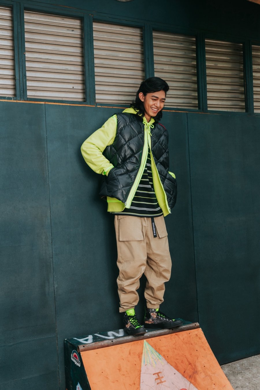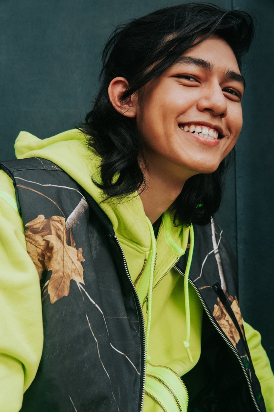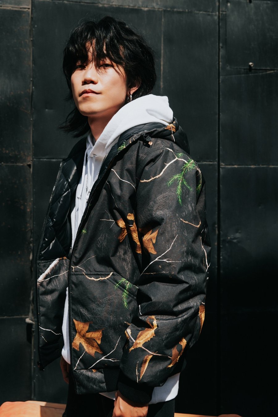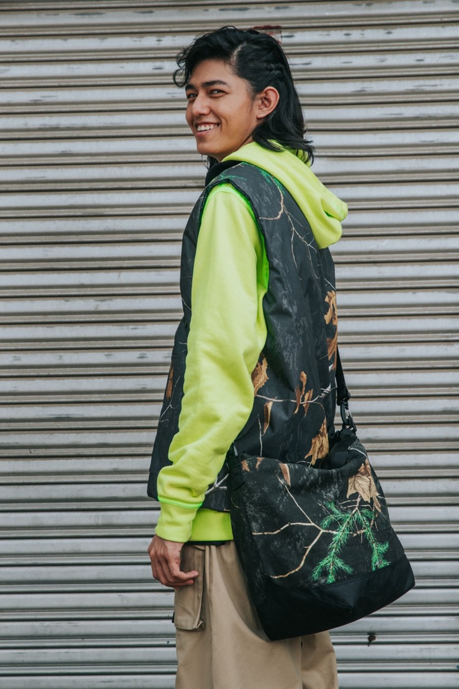 另一款迷彩图案的背心也采运用了双面设计,可两面穿着打造不同的造型,与本次系列主题相呼应,搭配羊羔绒材质连帽,展现街头风格。