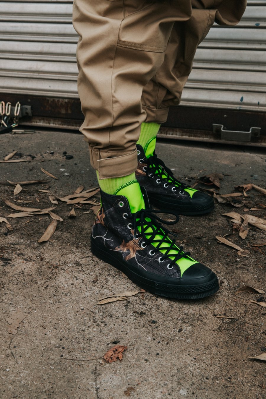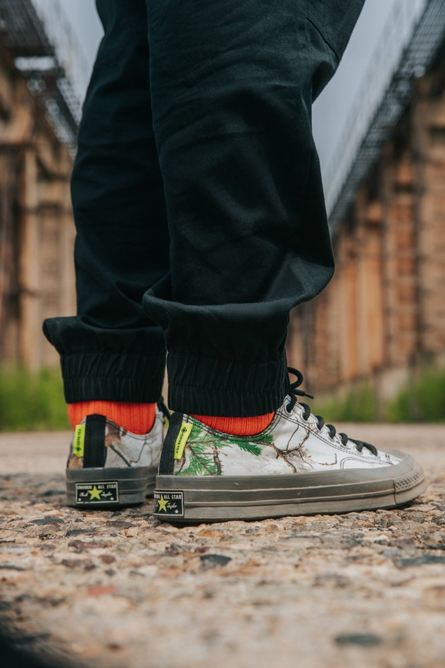 鞋款方面采用高、低帮的 Chuck 70 为蓝本,图案以迷彩花纹和 GORE-TEX 防水材质覆盖鞋面,满足时尚的同时,又不乏舒适与实用的需求。