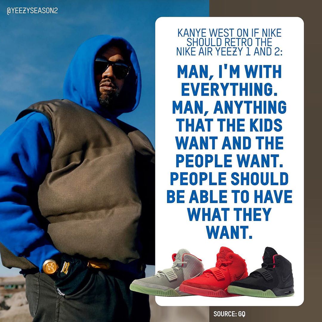 “所有人都应该得到自己想要的东西,只要孩子们和大伙想要,我并不介意 Nike 复刻 Air Yeezy 系列。”