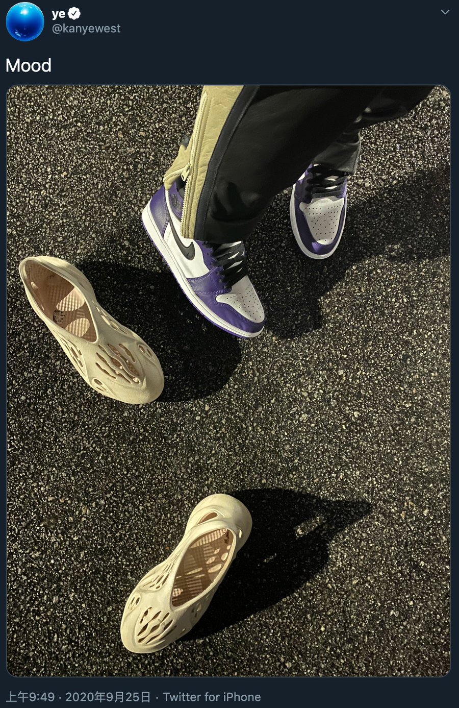 不曾想,侃爷昨天就在 Twitter 晒了张穿紫加哥 Air Jordan 1 上脚照,边有双 Yeezy Foam 无辜的躺在一旁。