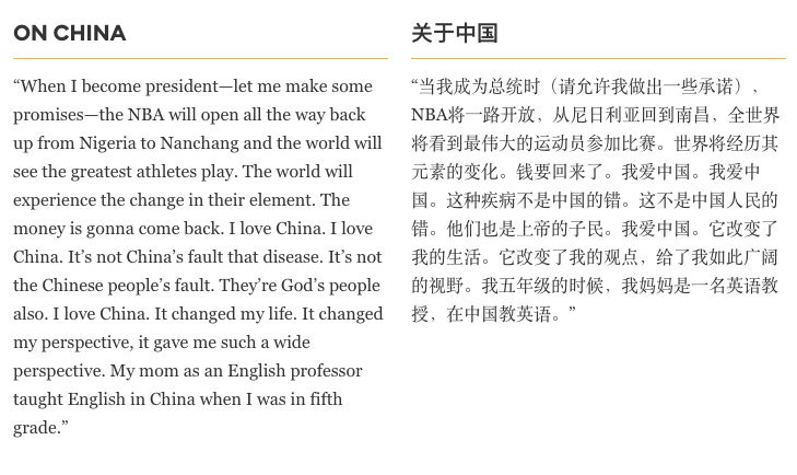 更谈到了中国,以及他小学五年级在中国的经历,“I love China” 在他的采访稿中出现了三次。