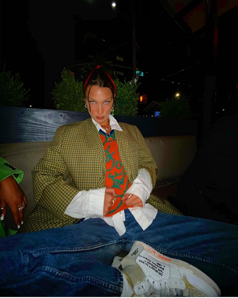 Bella 近期上脚天价球鞋 OFF WHITE x Air Jordan 1,搭配深色牛仔裤和Oversized 格子西装。