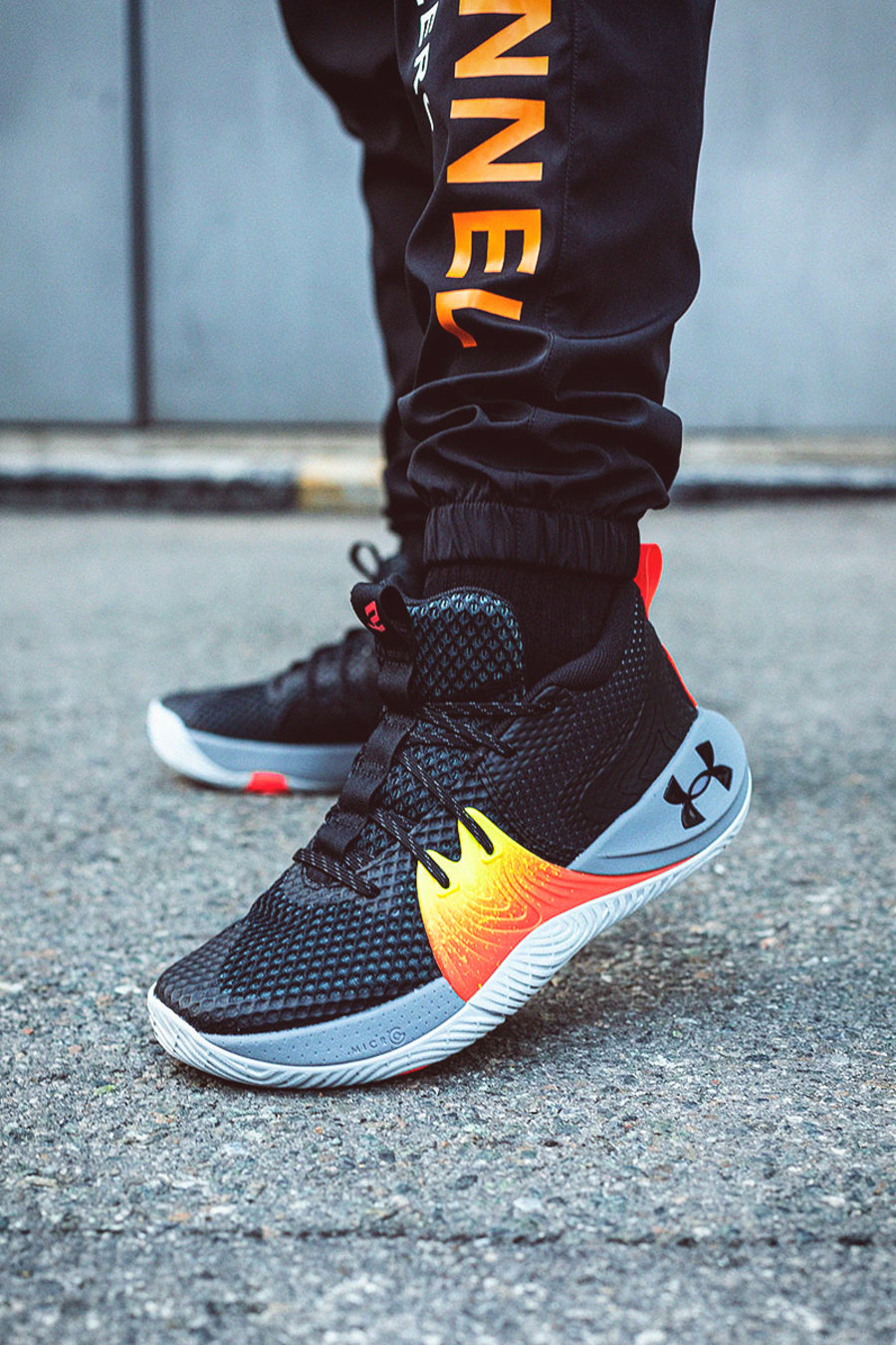 鞋身中部位置带有 TPU 支撑片,同时渐变火焰效果装饰上脚十分抢眼。
