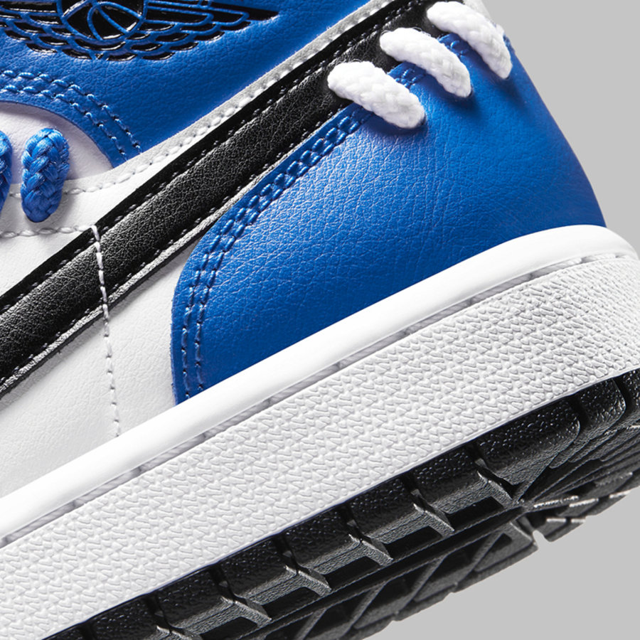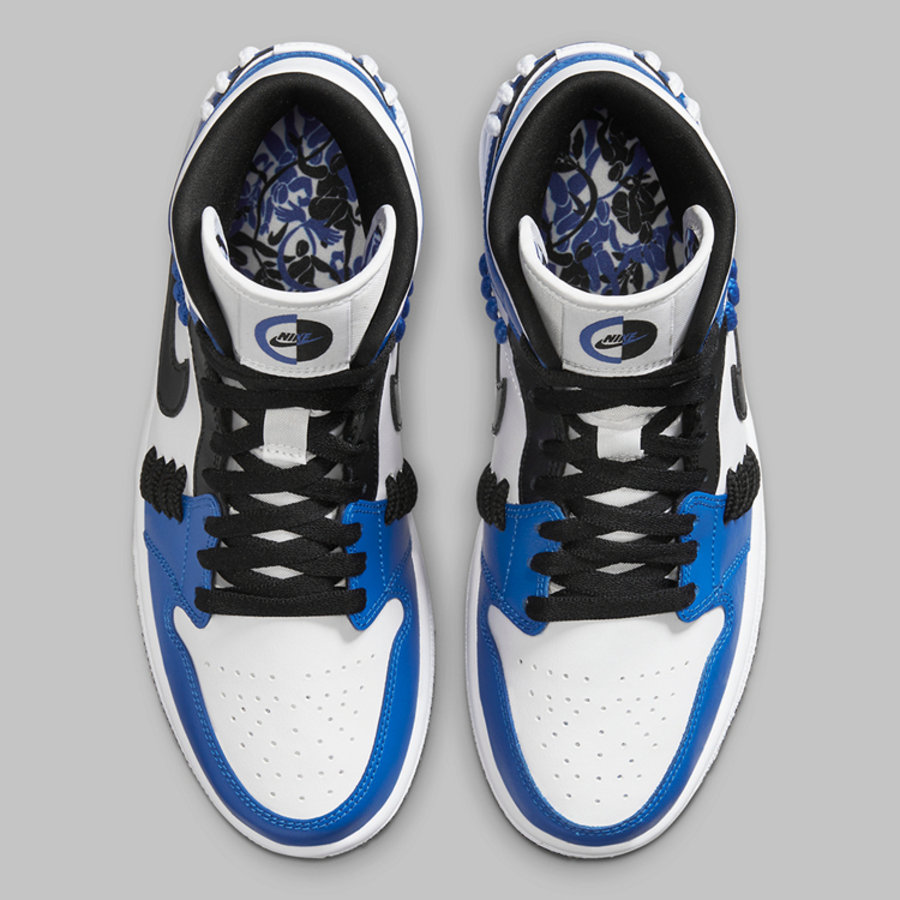 鞋身以经典蓝、白、黑三色构造,整体造型酷似当年火爆一时的 AJ1 小闪电。