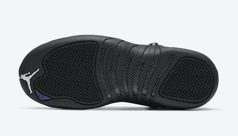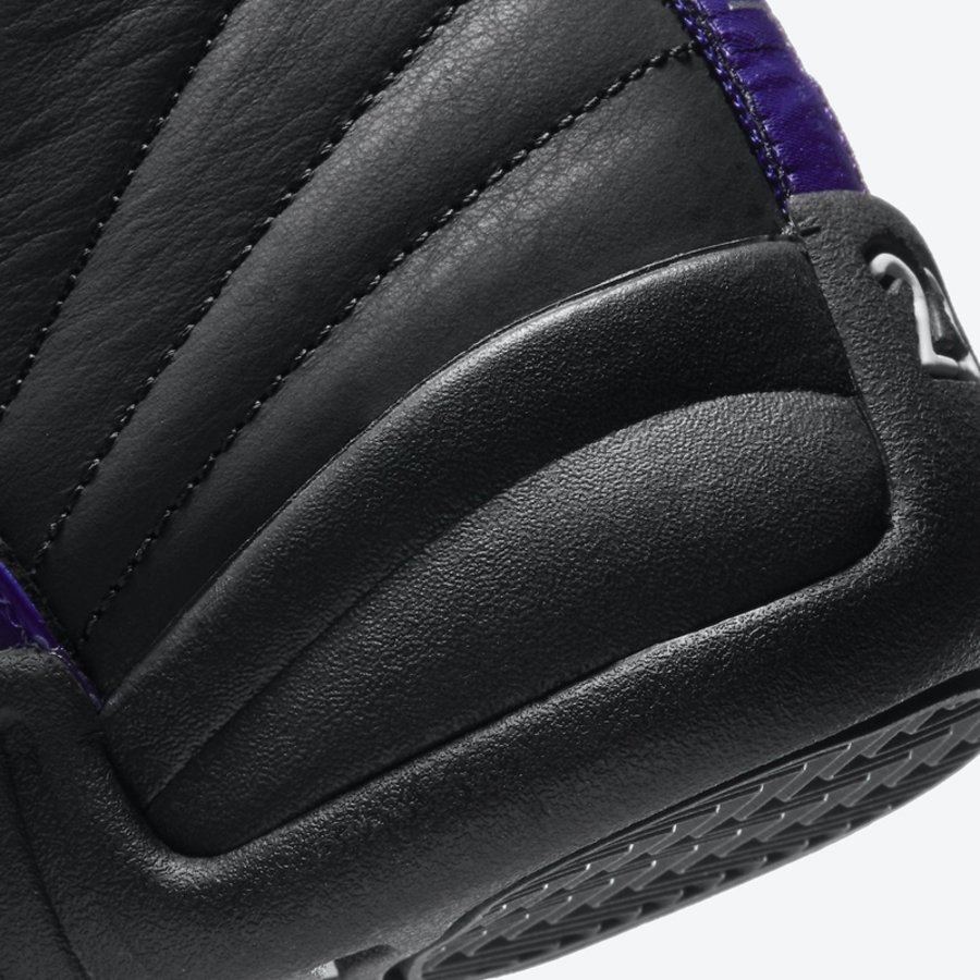 Air Jordan 12 标志性的鞋带扣和中低位置都采用了电光紫点缀,效果极为吸睛。