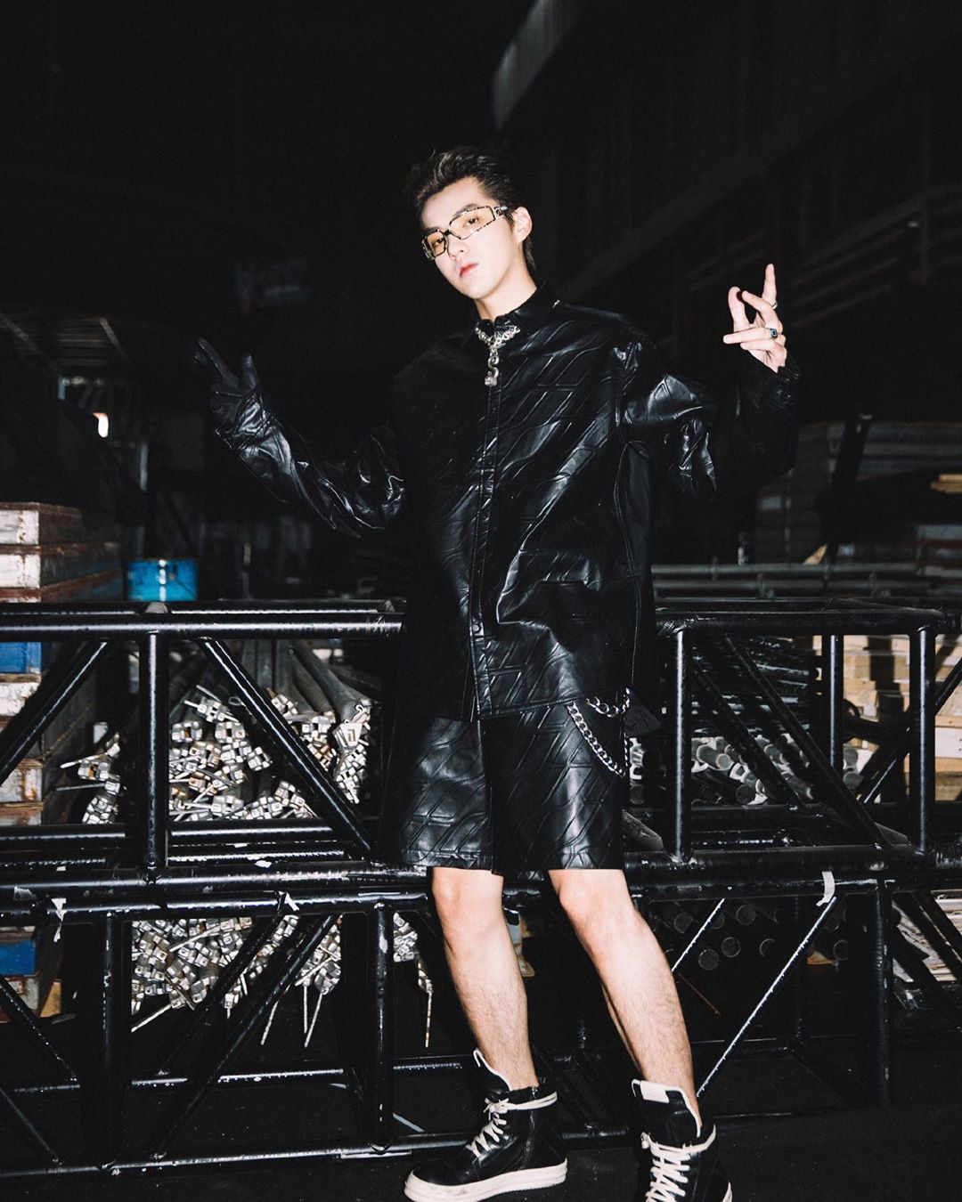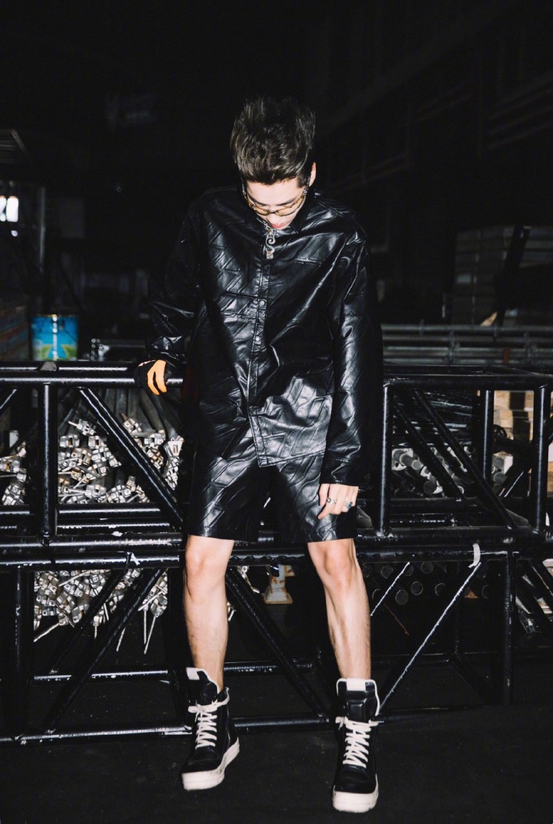 一身黑色系穿搭,皮衣皮短裤+鞋帮超高的皮质 Rick Owens,搁一般人穿可能早就翻车了。