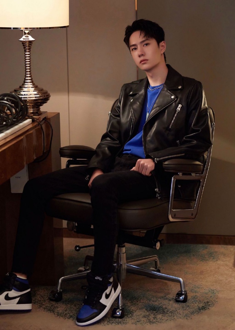 活动中,以一袭黑皮衣内搭蓝色打底,与脚下小闪电 Air Jordan 1 和谐呼应。