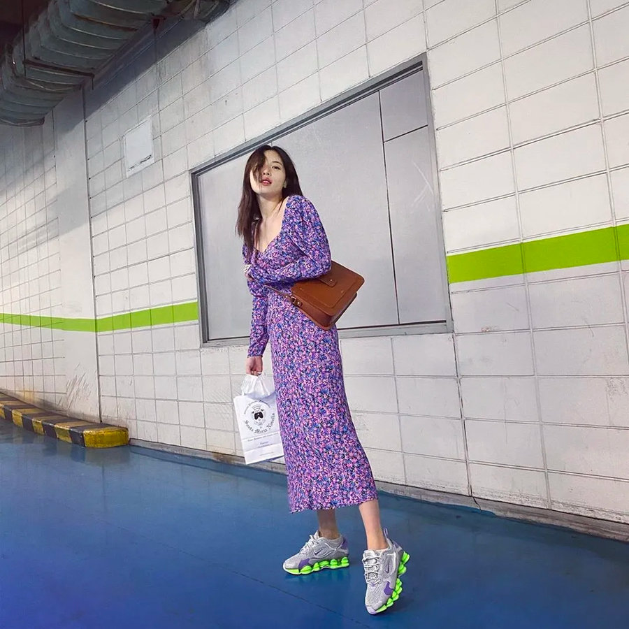 像这种碎花长裙 + 球鞋的穿搭,搁一般人是妥妥的翻车组合啊。