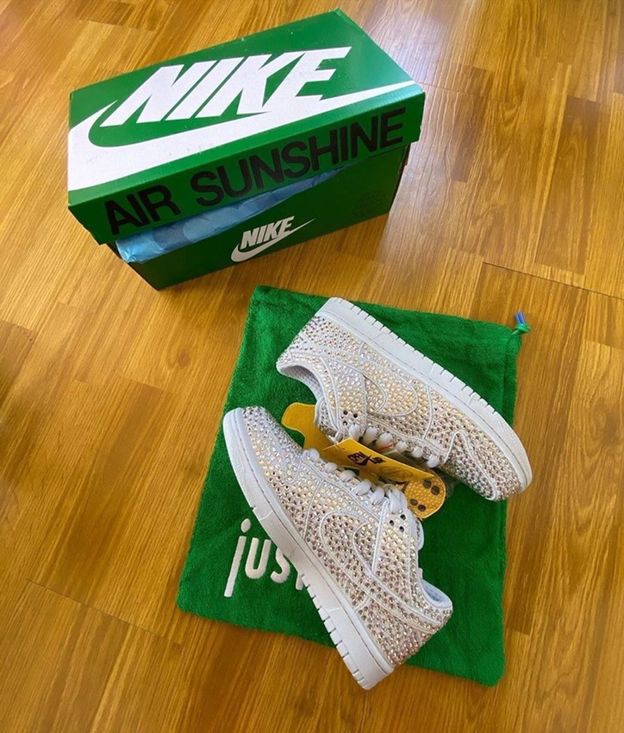 本次 Cactus Plant Flea Market 与 Nike 围绕简约的纯白 Dunk Low 为载体,将水钻布满鞋身,营造出极为奢华的视觉冲击。