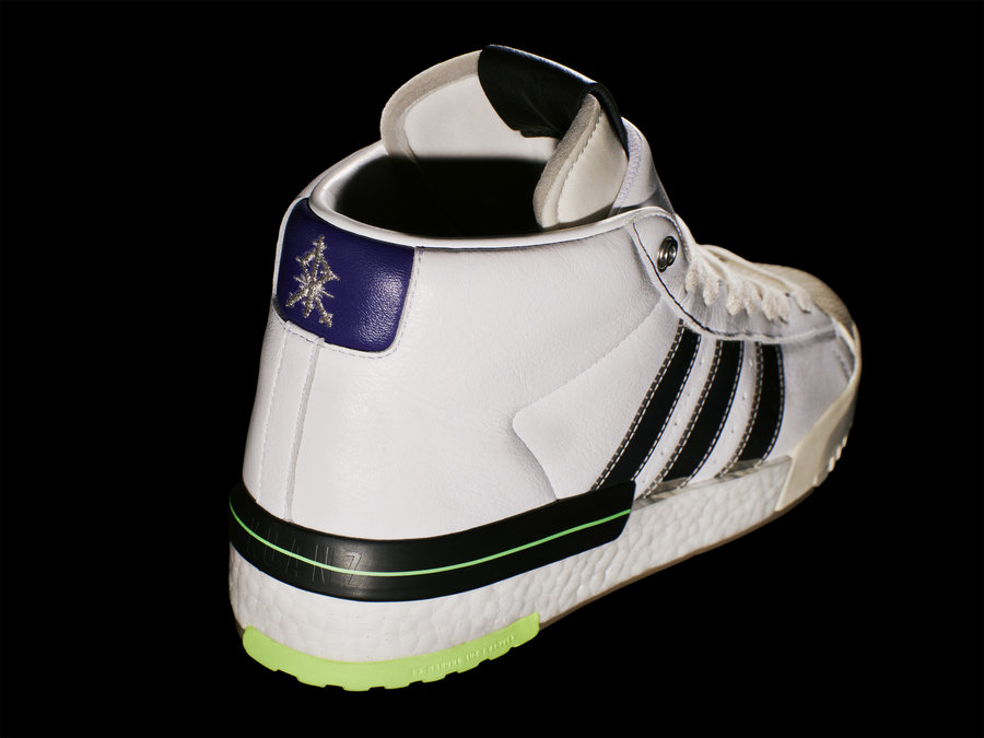 鞋身侧面蓝色凝胶凸显张扬个性,双层鞋舌设计上饰有 adidas 标志,后跟 SANKUANZ Logo 彰显联名身份。