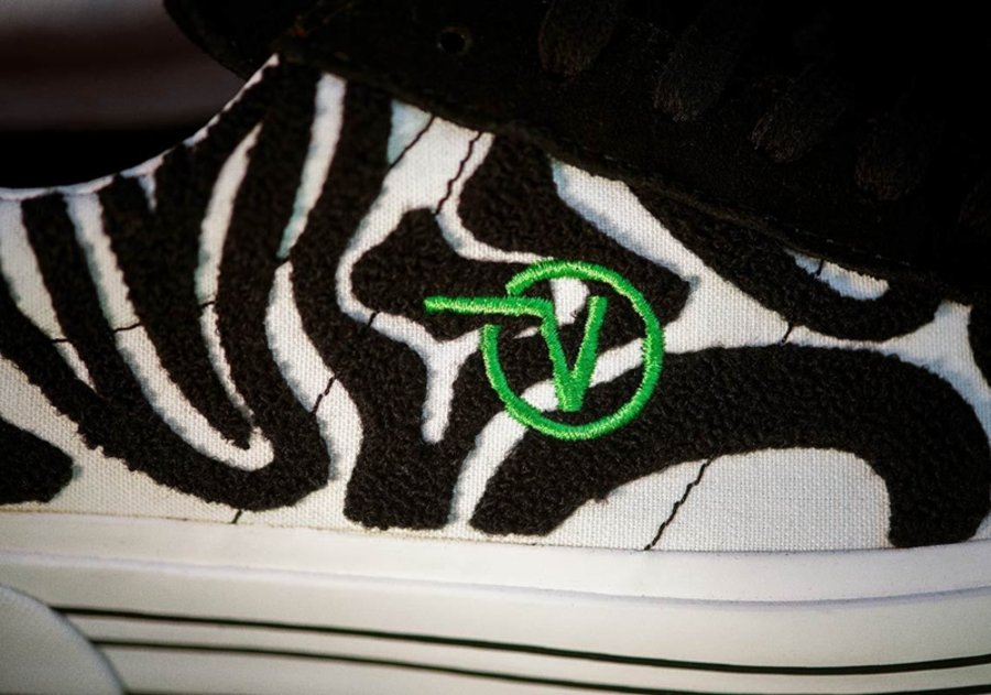 另一双以黑色为主体辅以白色打底,运用大面积毛绒材质以条纹样式覆盖鞋身,鞋身侧面标有绿色 Vans Logo。