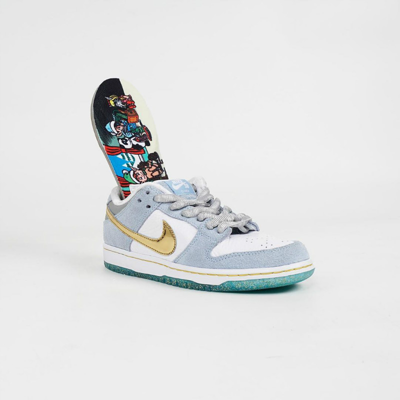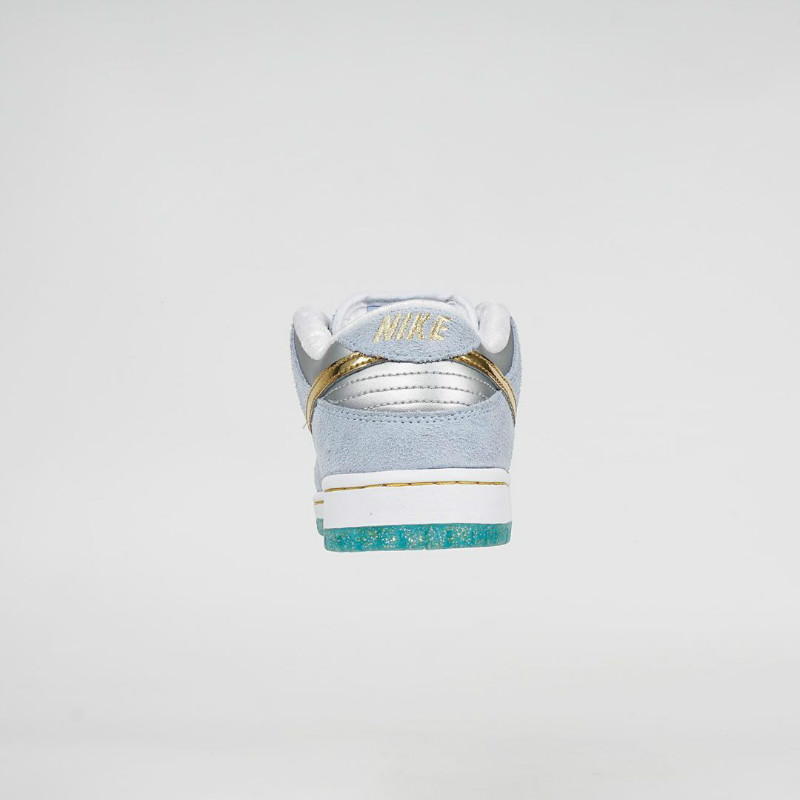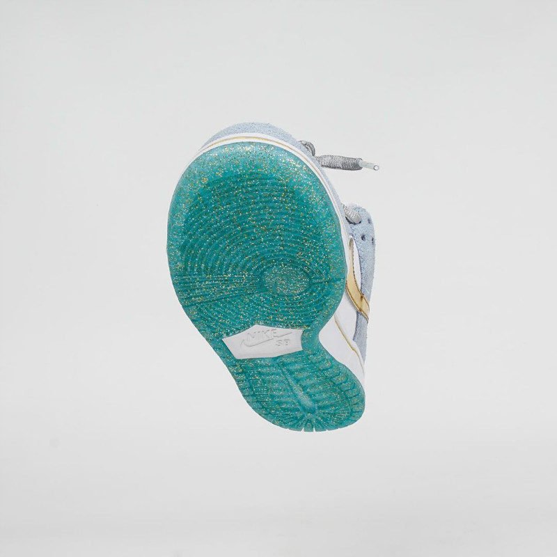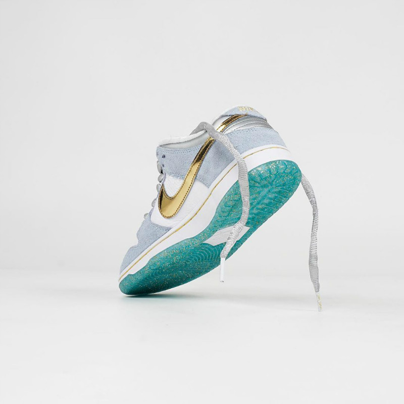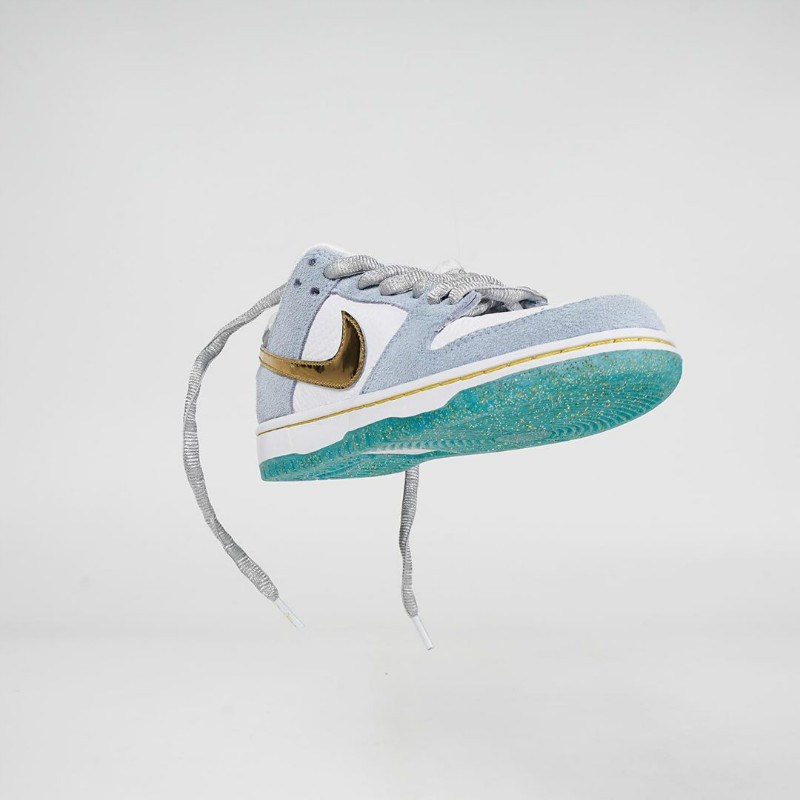 年初圈粉无数的情人节 StrangeLove x Nike SB Dunk Low 就由他参与设计,本次采用了液态金色 Swoosh,点缀白色和浅蓝搭配的鞋身上,显得格外的耀眼。