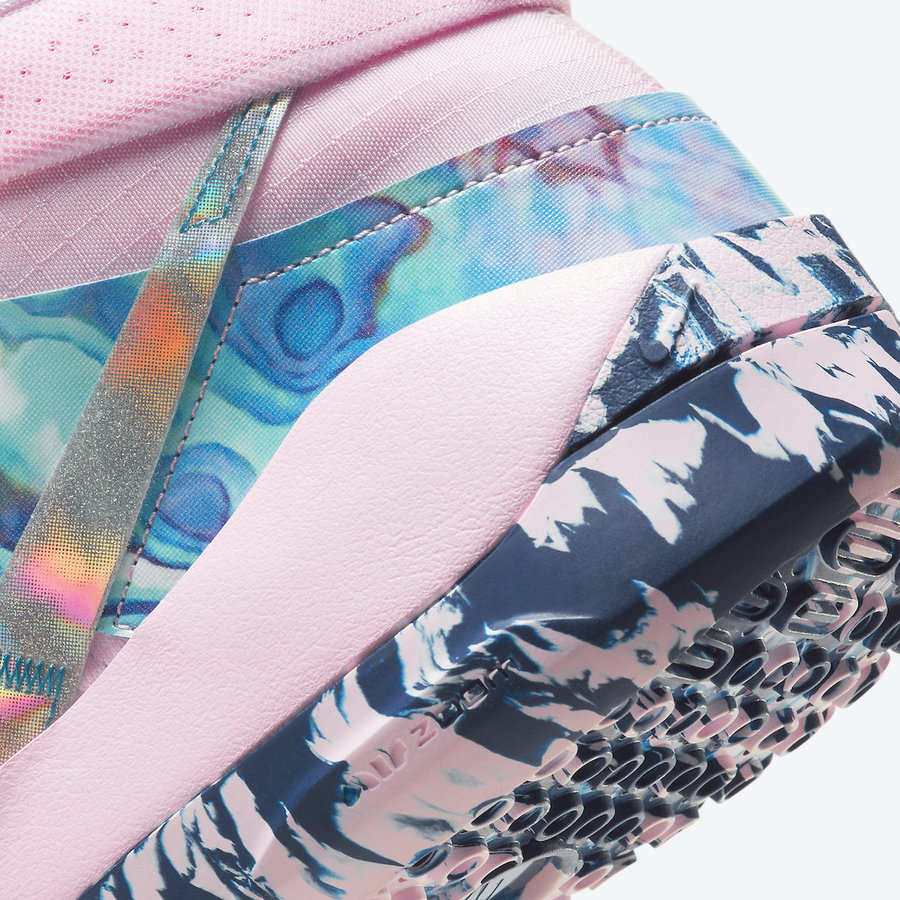 粉色鞋面为主基调,侧身银色 Swoosh Logo 衬托在晕染波纹中,整双鞋犹如独角兽般,散发着梦幻气息。