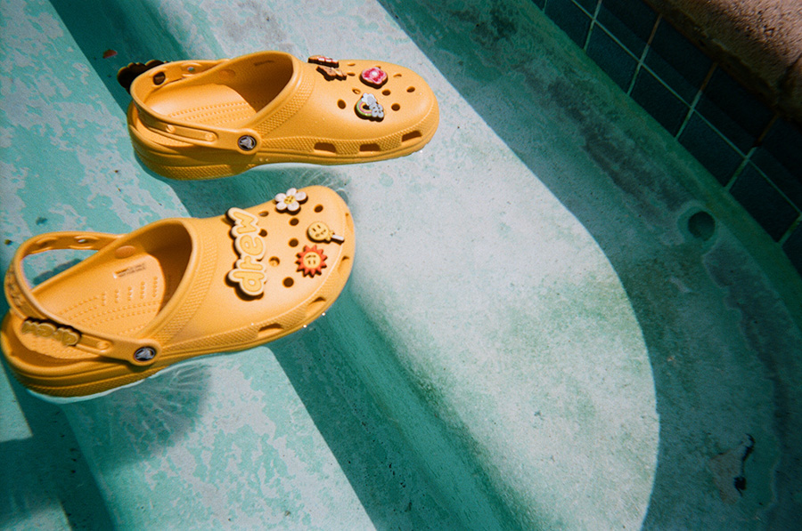 此前他在自己的 Instagram 上释出了预告图片,以漂浮在水池水面上的一对黄色 Crocs,宣告了与这个洞洞鞋品牌的联名合作。