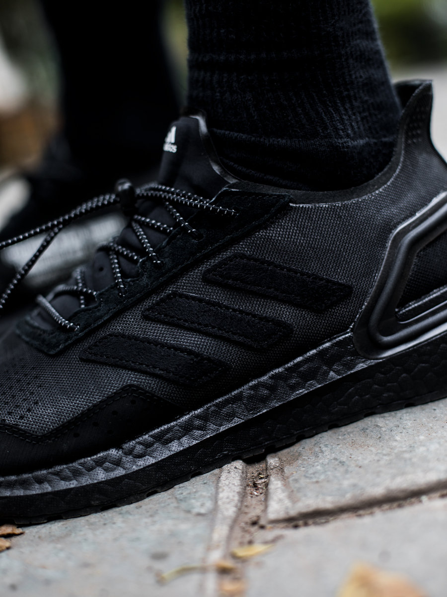 以纯黑色为主调的 Ultra Boost PB 散发着浓郁的黑魂气息,功能定位于快跑。