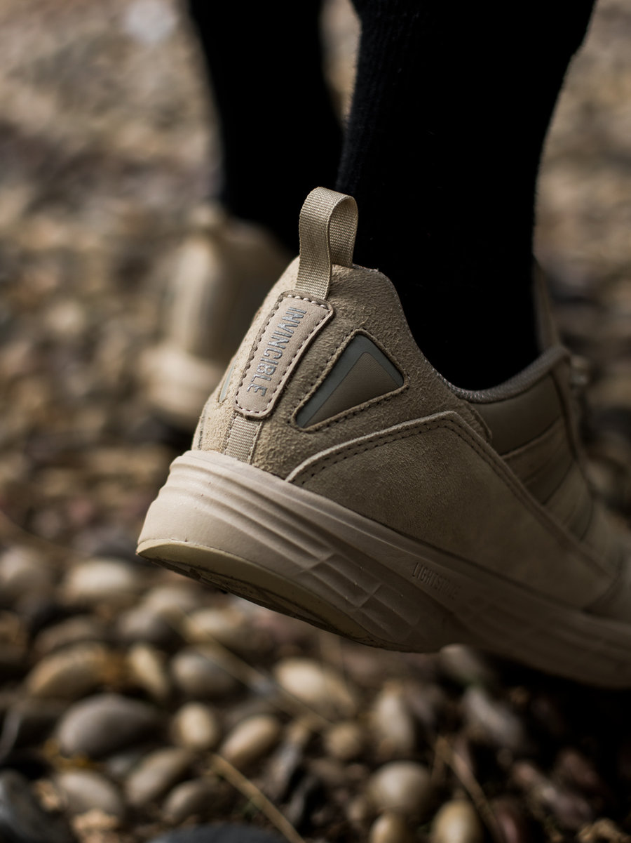 后跟点缀银色的 INVINCIBLE 品牌 Logo,依旧是在细节上着重高级质感的表达。