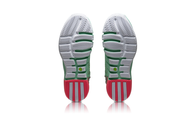 湖水绿鞋身搭配深灰色后跟,采用大胆的切割元素呈现,营造出醒目的撞色效果。