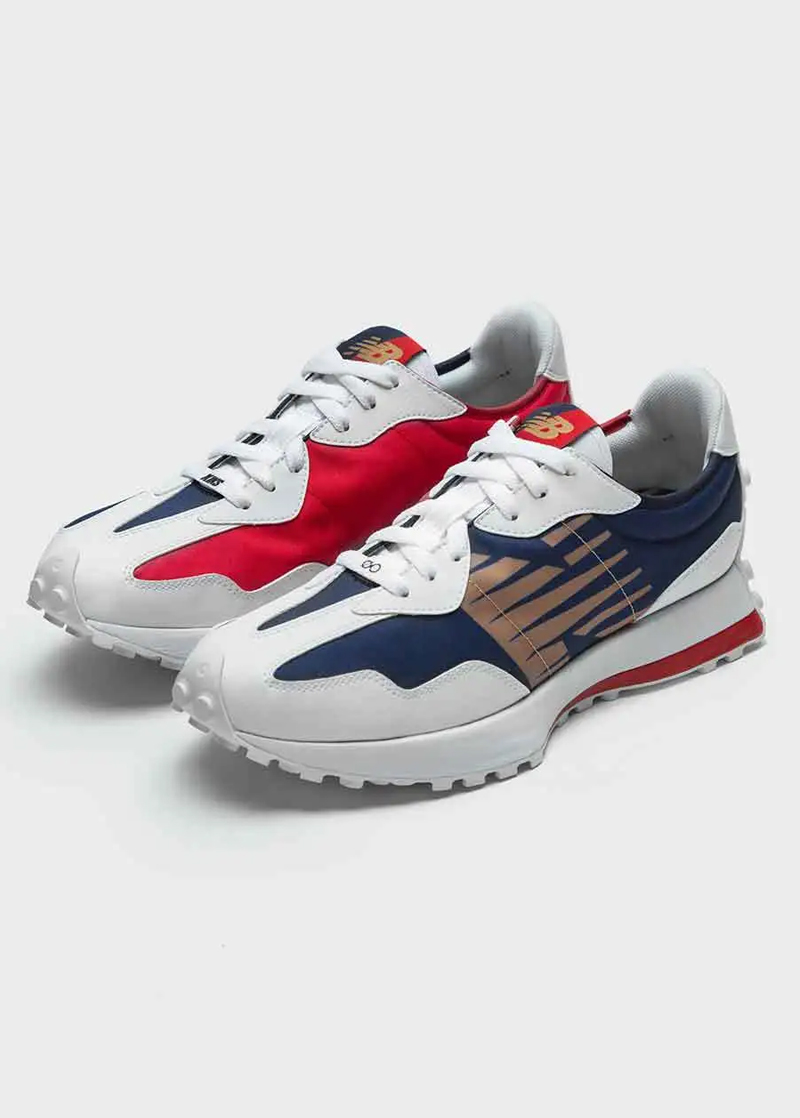 结合创新之作 327 的复古造型,运用蓝、红、金三色赋予时尚的艺术观感,鞋带处点缀双方 Logo,呼应环保主题的同时更彰显联名身份。