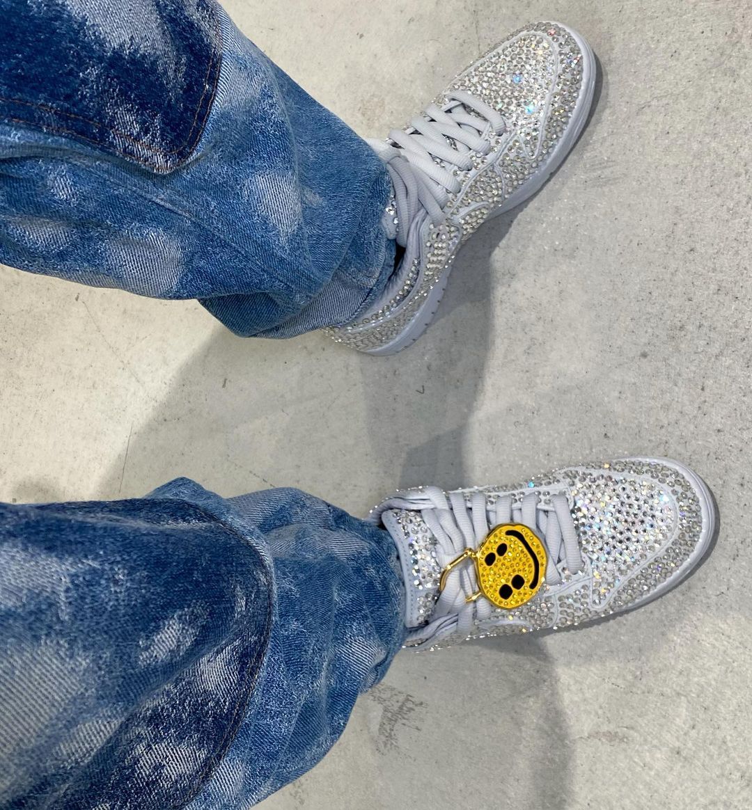 整双鞋在灰白色基础上,鞋身贴满了水钻,带来极为奢华的视觉效果。