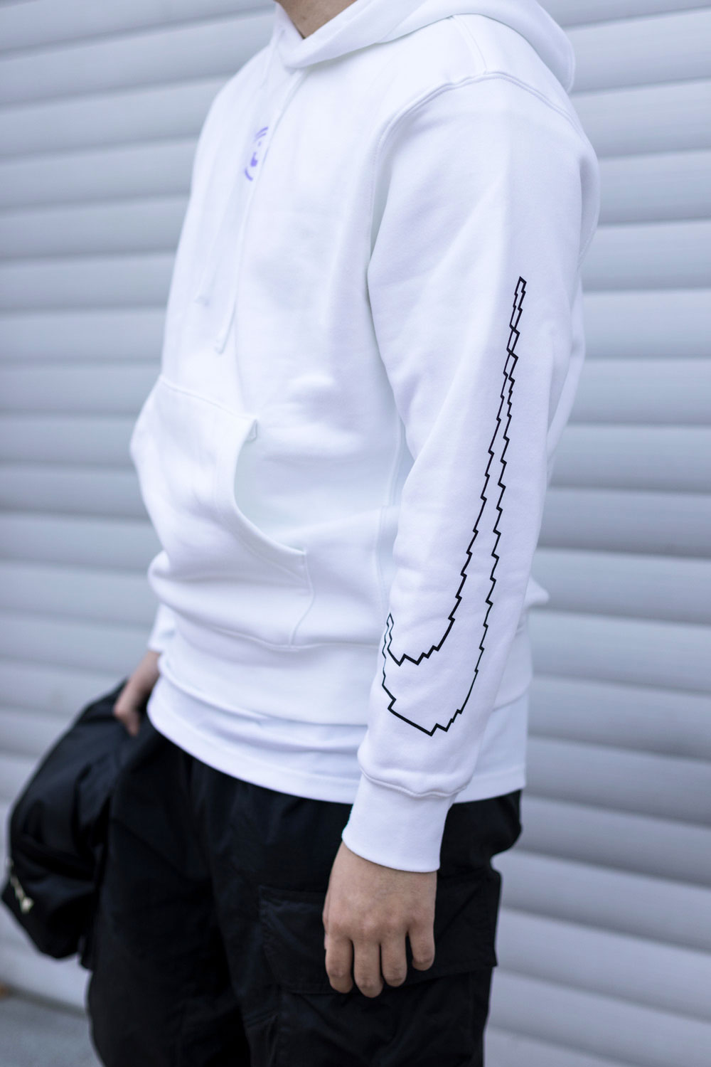 左手袖口的 8Bit 像素块 Swoosh 致敬电子游戏起源。