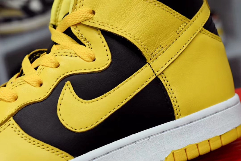 鞋身整体延续高帮 Dunk 的经典造型,采用黑色为底,辅以黄色框架覆盖,视觉效果十分吸睛。