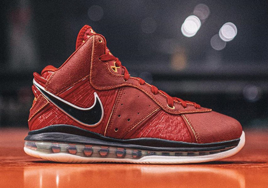 Lebron 8 采用红色为主调,黄色点缀细节,白色线条勾勒黑色 Swoosh,极其吸睛。