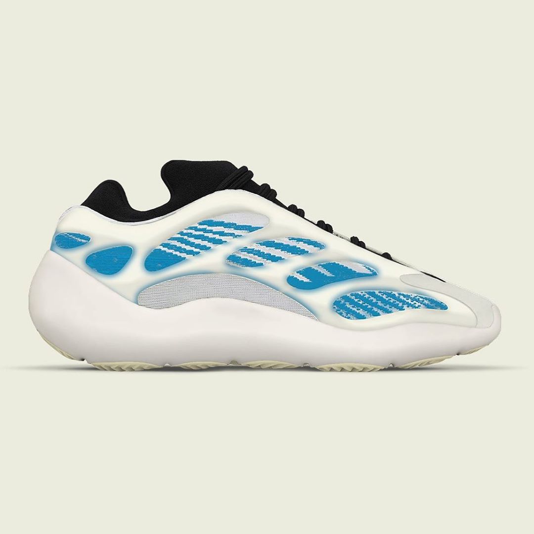 从效果图中看出全新配色以白色和蓝色为主,和已经发售的极光 Yeezy 700 V3 “Arzareth” 风格相似,只不过这双是以白色为主。